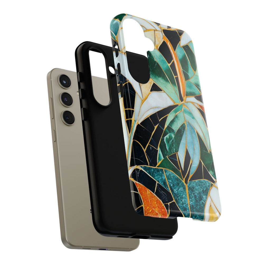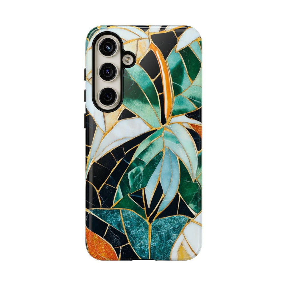 Dit telefoonhoesje heeft een levendig mozaïekpatroon van tropische bladeren in diverse tinten groen, geel, oranje, wit en blauw. De bladeren zijn omlijnd met goudkleurige lijnen, wat zorgt voor een glas-in-lood effect. De zwarte achtergrond laat de kleurrijke bladeren extra opvallen. Het hoesje is glanzend en stevig dankzij de polycarbonaat buitenkant en TPU binnenzijde, wat zorgt voor dubbele bescherming en ondersteuning voor draadloos opladen. Het ontwerp straalt een tropische, artistieke sfeer uit en heeft een marmerachtige textuur.