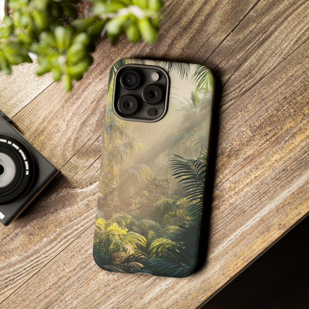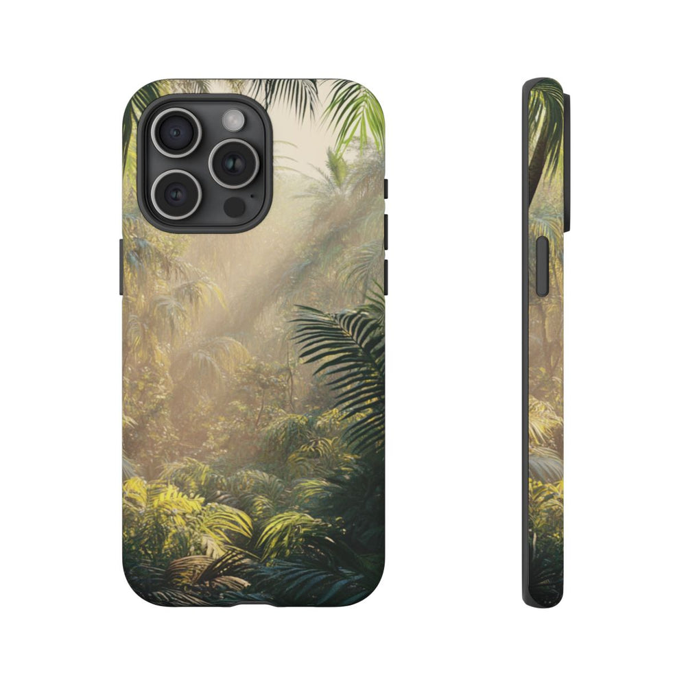 Dit hoesje heeft een ontwerp met een dicht tropisch bos, weelderige groene palmbladeren en hoge bomen. Zonlicht schijnt door het bladerdak en zorgt voor een warme, nevelige sfeer waarin lichtstralen het groen verlichten. Het beeld brengt de natuurlijke schoonheid en diepte van een tropische jungle tot leven. Het stevige hoesje bestaat uit twee lagen van polycarbonaat en TPU en is geschikt voor draadloos opladen en gebruik buitenshuis.