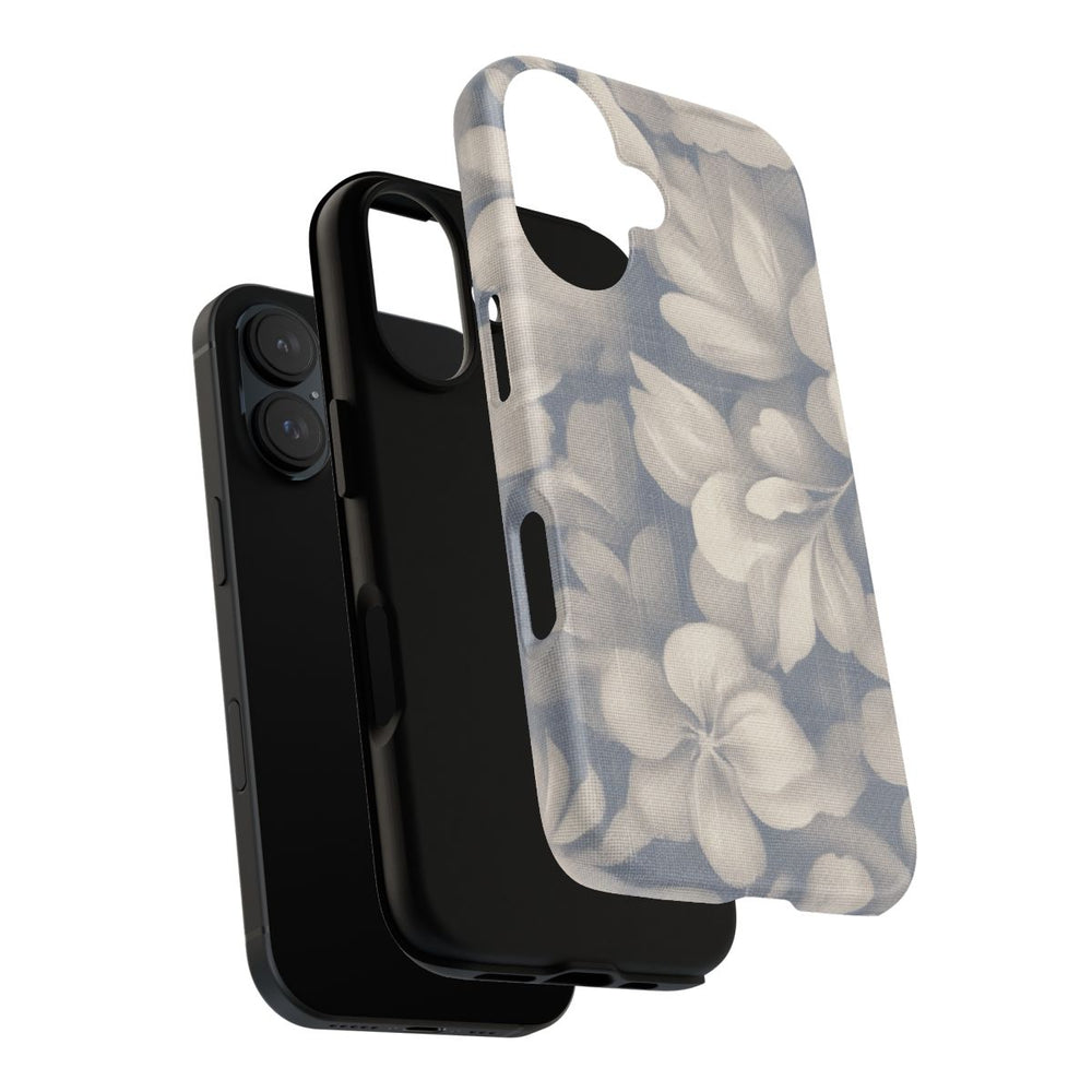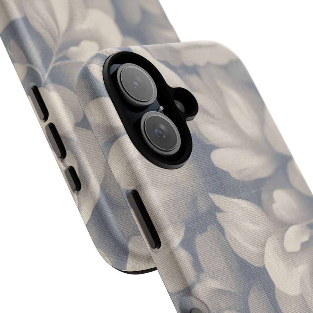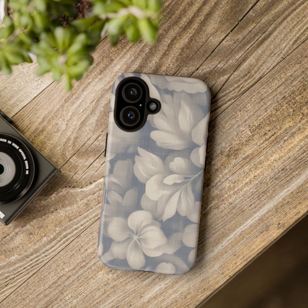 Dit hoesje is voorzien van een naadloos bloemenpatroon met verschillende bloemen en bladeren in zachte beigetinten op een gedempte blauwe achtergrond. De bloemen zijn gedetailleerd met schaduwen, waardoor ze een handgetekende, linnenachtige structuur krijgen. Het patroon is verfijnd en geïnspireerd op een vintage stijl, wat zorgt voor een klassieke en elegante uitstraling. Het hoesje bestaat uit twee lagen: een stevige polycarbonaat buitenkant en een TPU-binnenzijde. Dit biedt extra stevigheid en bescherming tegen weersinvloeden, terwijl draadloos opladen ondersteund blijft.