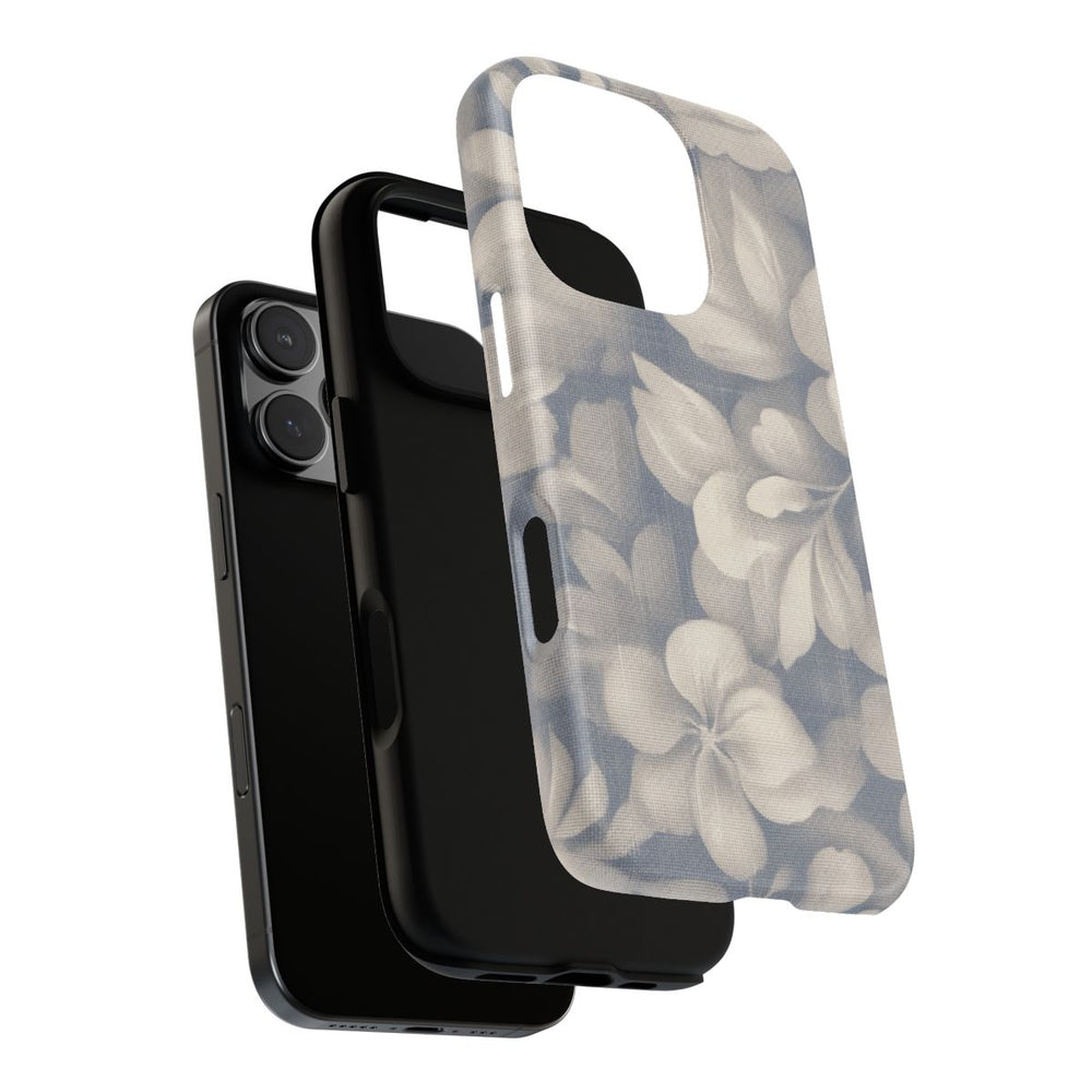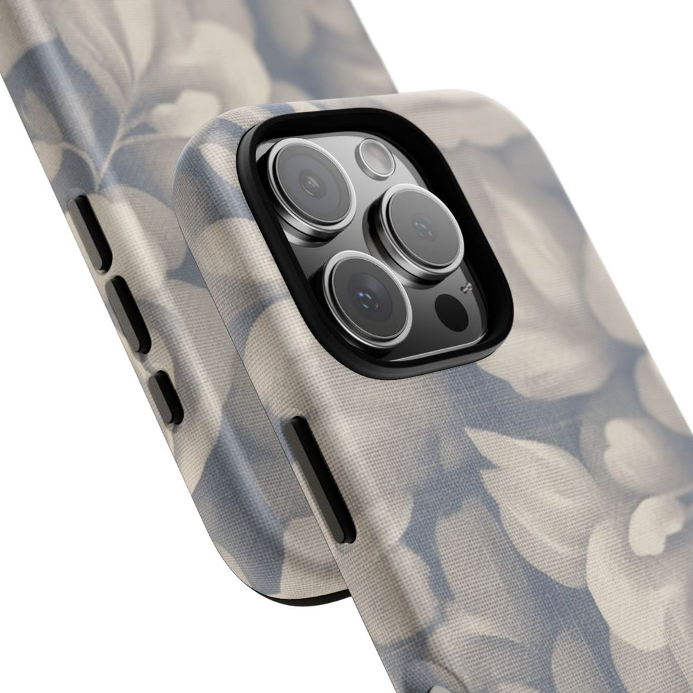 Dit hoesje is voorzien van een naadloos bloemenpatroon met verschillende bloemen en bladeren in zachte beigetinten op een gedempte blauwe achtergrond. De bloemen zijn gedetailleerd met schaduwen, waardoor ze een handgetekende, linnenachtige structuur krijgen. Het patroon is verfijnd en geïnspireerd op een vintage stijl, wat zorgt voor een klassieke en elegante uitstraling. Het hoesje bestaat uit twee lagen: een stevige polycarbonaat buitenkant en een TPU-binnenzijde. Dit biedt extra stevigheid en bescherming tegen weersinvloeden, terwijl draadloos opladen ondersteund blijft.