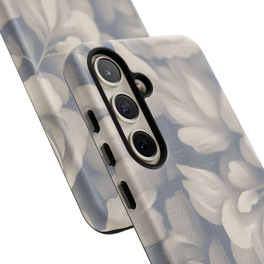 Dit hoesje is voorzien van een naadloos bloemenpatroon met verschillende bloemen en bladeren in zachte beigetinten op een gedempte blauwe achtergrond. De bloemen zijn gedetailleerd met schaduwen, waardoor ze een handgetekende, linnenachtige structuur krijgen. Het patroon is verfijnd en geïnspireerd op een vintage stijl, wat zorgt voor een klassieke en elegante uitstraling. Het hoesje bestaat uit twee lagen: een stevige polycarbonaat buitenkant en een TPU-binnenzijde. Dit biedt extra stevigheid en bescherming tegen weersinvloeden, terwijl draadloos opladen ondersteund blijft.