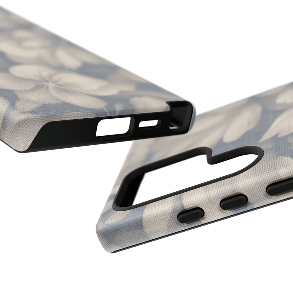 Dit hoesje is voorzien van een naadloos bloemenpatroon met verschillende bloemen en bladeren in zachte beigetinten op een gedempte blauwe achtergrond. De bloemen zijn gedetailleerd met schaduwen, waardoor ze een handgetekende, linnenachtige structuur krijgen. Het patroon is verfijnd en geïnspireerd op een vintage stijl, wat zorgt voor een klassieke en elegante uitstraling. Het hoesje bestaat uit twee lagen: een stevige polycarbonaat buitenkant en een TPU-binnenzijde. Dit biedt extra stevigheid en bescherming tegen weersinvloeden, terwijl draadloos opladen ondersteund blijft.