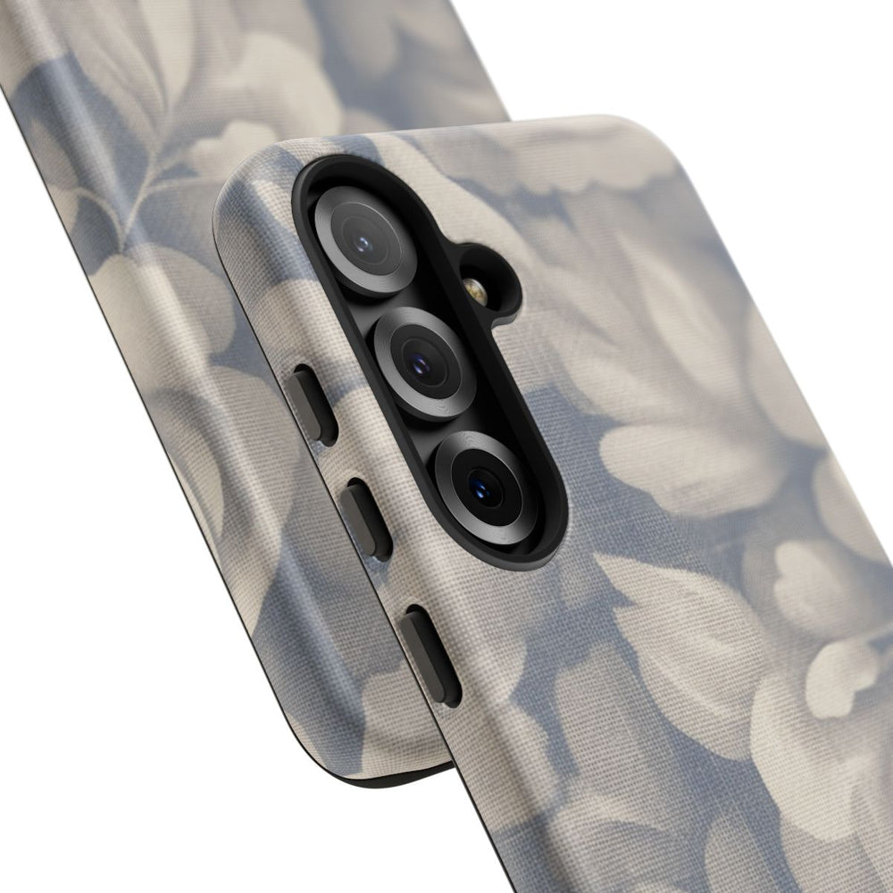 Dit hoesje is voorzien van een naadloos bloemenpatroon met verschillende bloemen en bladeren in zachte beigetinten op een gedempte blauwe achtergrond. De bloemen zijn gedetailleerd met schaduwen, waardoor ze een handgetekende, linnenachtige structuur krijgen. Het patroon is verfijnd en geïnspireerd op een vintage stijl, wat zorgt voor een klassieke en elegante uitstraling. Het hoesje bestaat uit twee lagen: een stevige polycarbonaat buitenkant en een TPU-binnenzijde. Dit biedt extra stevigheid en bescherming tegen weersinvloeden, terwijl draadloos opladen ondersteund blijft.