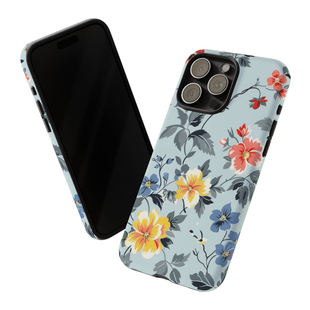 Dit hoesje is voorzien van een klassiek bloemenpatroon met diverse bloemen en bladeren op een lichtblauwe achtergrond. De bloemen zijn uitgevoerd in zachte tinten koraal, geel en blauw, terwijl de grijze en zwarte bladeren en stelen zorgen voor een stijlvol contrast. Het patroon is verfijnd en gedetailleerd, wat zorgt voor een elegante uitstraling. Het matte hoesje heeft een stevige dubbele laag voor extra bescherming en duurzaamheid. Ondersteunt draadloos opladen, maar is niet geschikt voor MagSafe.