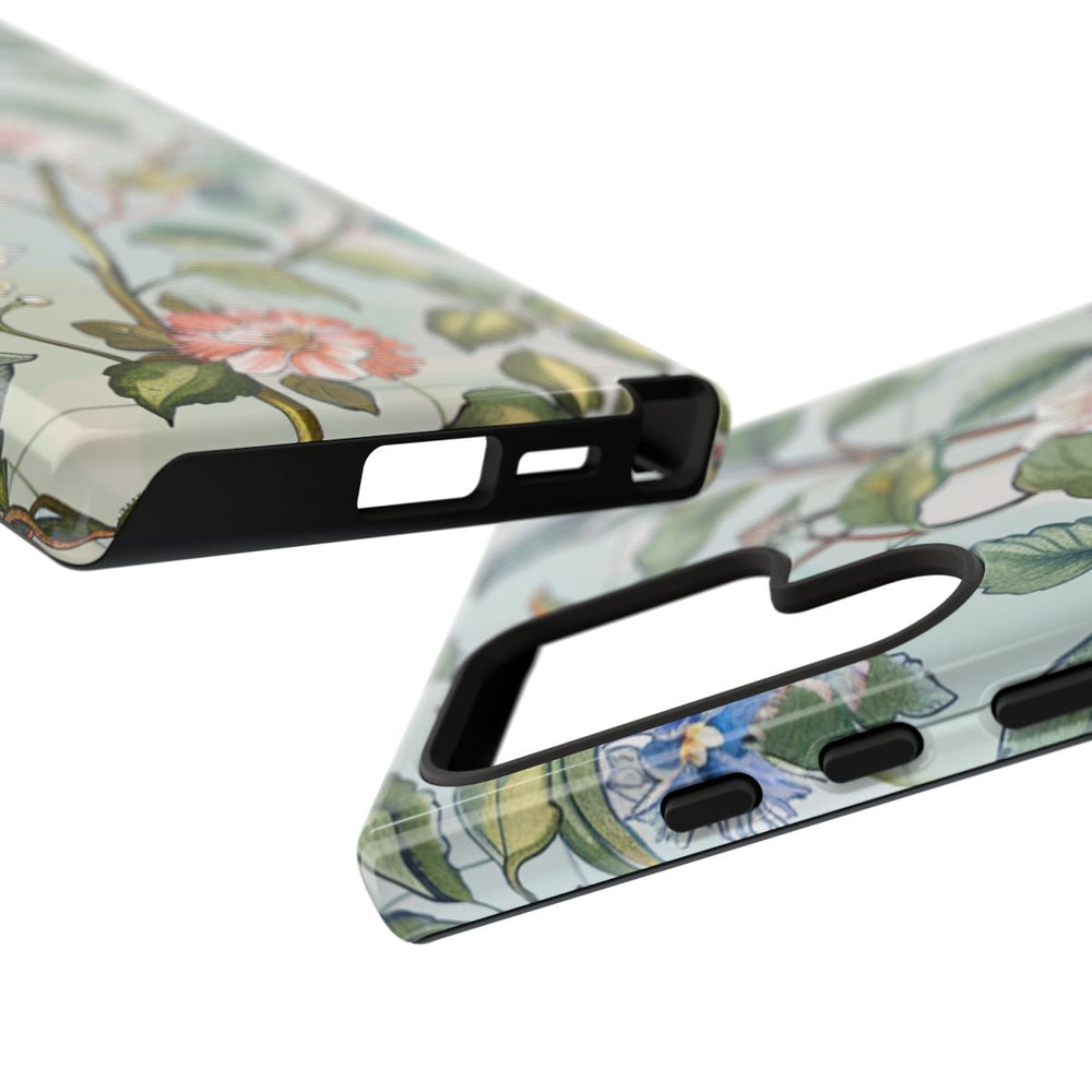 Dit telefoonhoesje heeft een klassiek patroon van bloemen en bladeren in vintagestijl, versierd met sierlijke vlinders. De bloemen zijn uitgevoerd in zachte pasteltinten roze, geel, blauw en wit, omringd door weelderig groene bladeren. De achtergrond heeft een lichte, subtiele kleur met een fijn rasterpatroon, wat zorgt voor een elegante uitstraling. Het glanzende hoesje bestaat uit twee lagen voor extra stevigheid en is geschikt voor draadloos opladen.
