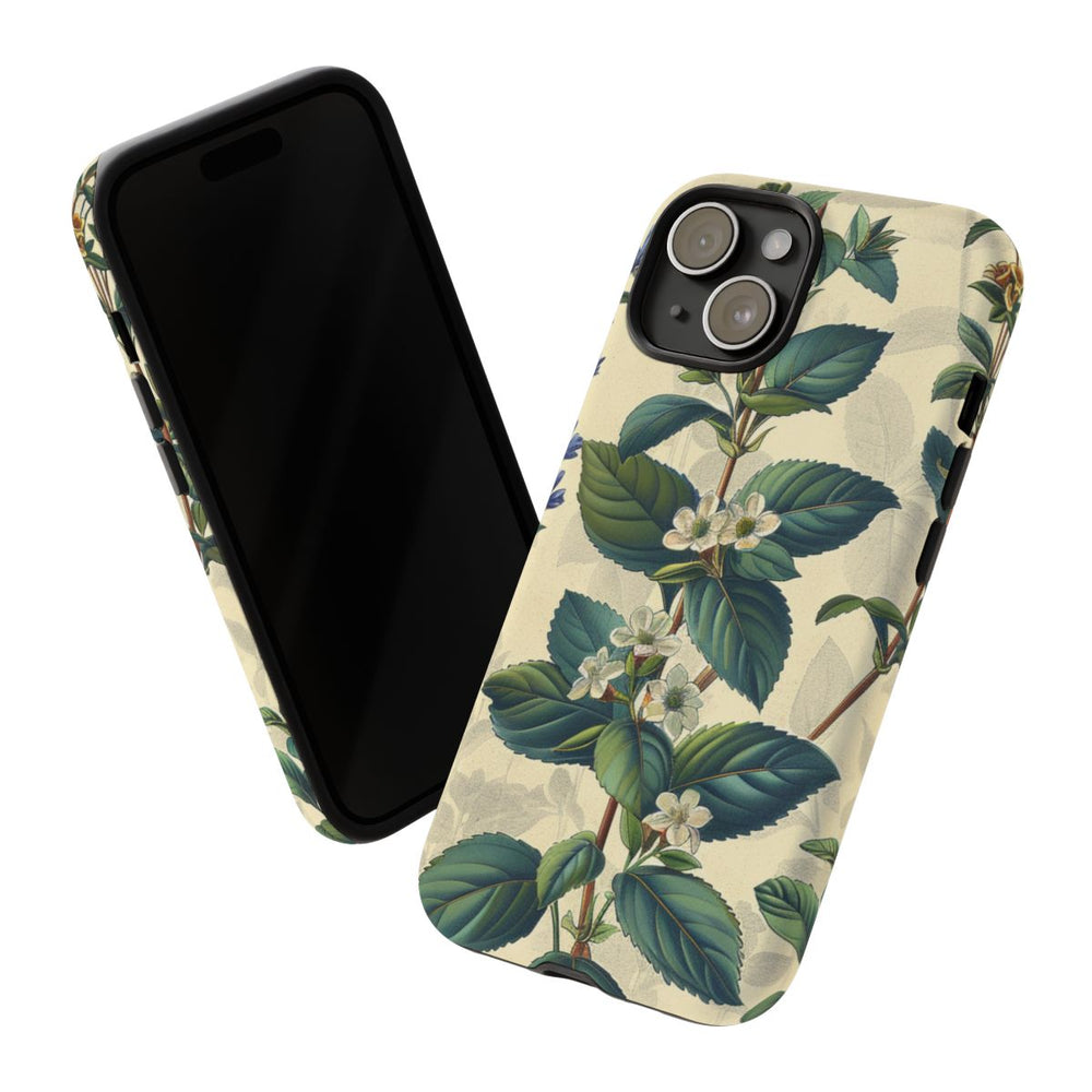 Dit hoesje is voorzien van een naadloos vintage botanisch patroon met gedetailleerde illustraties van verschillende kruiden. Het ontwerp toont groene bladeren en kleine bloemen in wit-, blauw- en geeltinten op een beige achtergrond. De klassieke, natuurlijke stijl met fijne lijnen en schaduwen geeft het hoesje een tijdloze uitstraling. Het stevige, matte hoesje bestaat uit twee lagen van polycarbonaat en TPU voor extra duurzaamheid en bescherming, en is geschikt voor draadloos opladen.