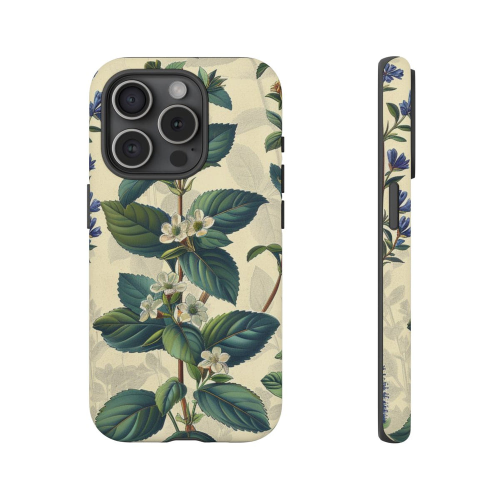 Dit hoesje is voorzien van een naadloos vintage botanisch patroon met gedetailleerde illustraties van verschillende kruiden. Het ontwerp toont groene bladeren en kleine bloemen in wit-, blauw- en geeltinten op een beige achtergrond. De klassieke, natuurlijke stijl met fijne lijnen en schaduwen geeft het hoesje een tijdloze uitstraling. Het stevige, matte hoesje bestaat uit twee lagen van polycarbonaat en TPU voor extra duurzaamheid en bescherming, en is geschikt voor draadloos opladen.