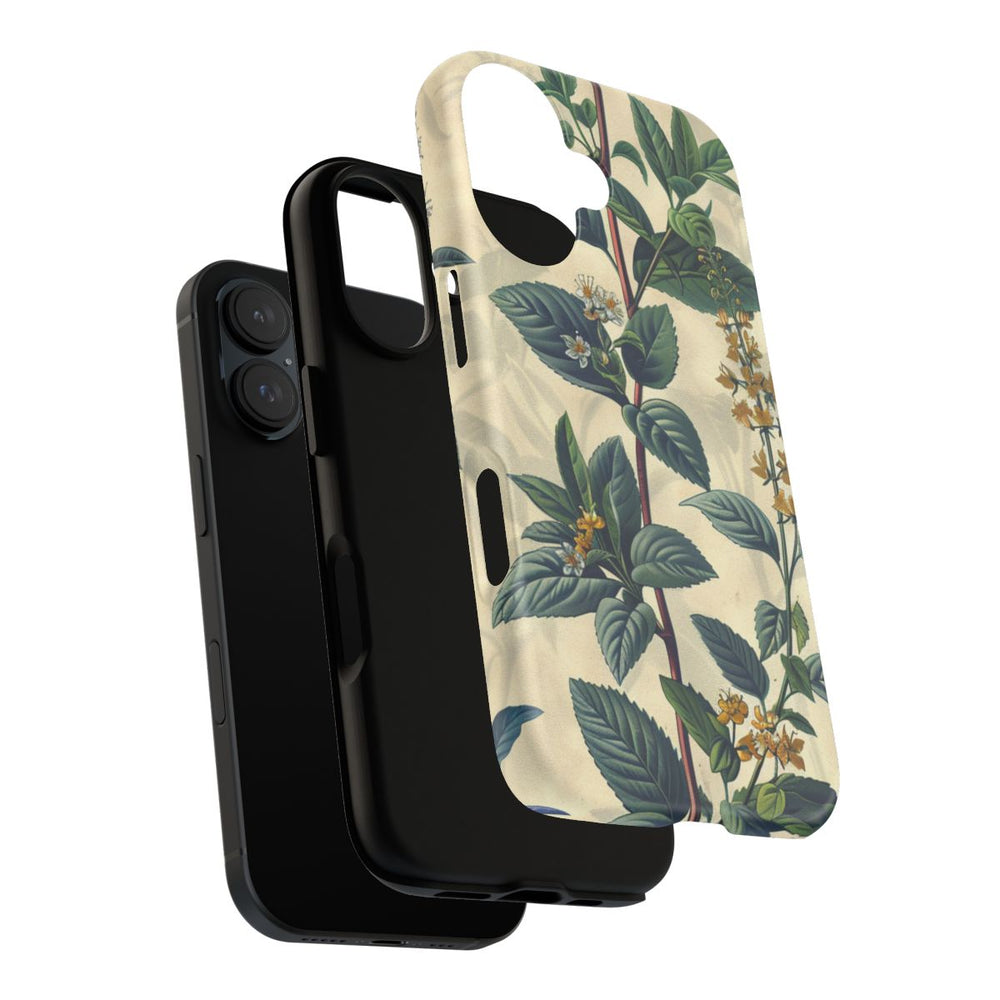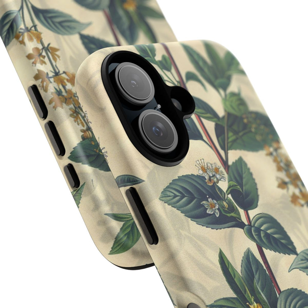 Dit hoesje is voorzien van een naadloos vintage botanisch patroon met gedetailleerde illustraties van groene bladeren en diverse kleine bloemen in witte, gele en blauwe tinten. De zachte beige achtergrond versterkt het natuurlijke en klassieke karakter van het ontwerp. Het motief loopt door over het hele oppervlak, wat zorgt voor een harmonieus en elegant geheel. Het matte, stevige hoesje is gemaakt van duurzaam polycarbonaat met een TPU-voering en biedt uitstekende bescherming en ondersteuning voor draadloos opladen.