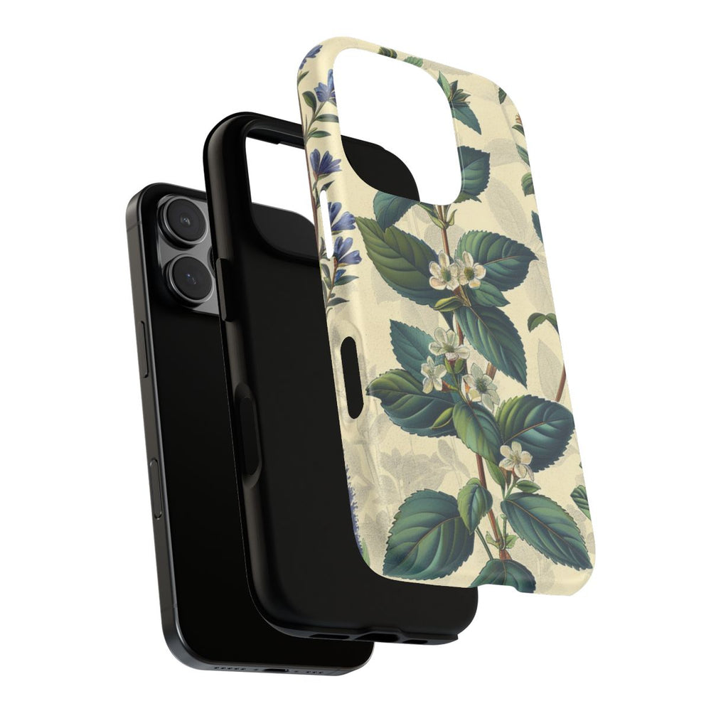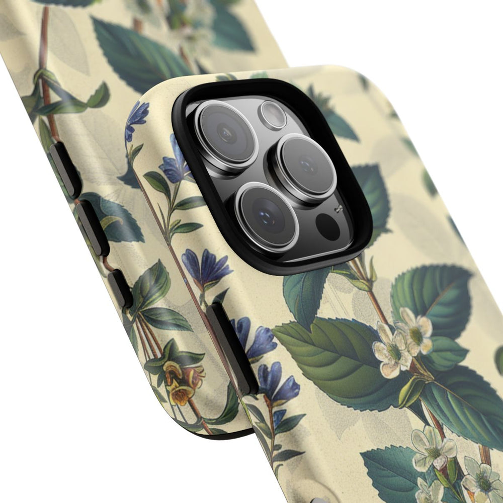 Dit hoesje is voorzien van een naadloos vintage botanisch patroon met gedetailleerde illustraties van verschillende kruiden. Het ontwerp toont groene bladeren en kleine bloemen in wit-, blauw- en geeltinten op een beige achtergrond. De klassieke, natuurlijke stijl met fijne lijnen en schaduwen geeft het hoesje een tijdloze uitstraling. Het stevige, matte hoesje bestaat uit twee lagen van polycarbonaat en TPU voor extra duurzaamheid en bescherming, en is geschikt voor draadloos opladen.