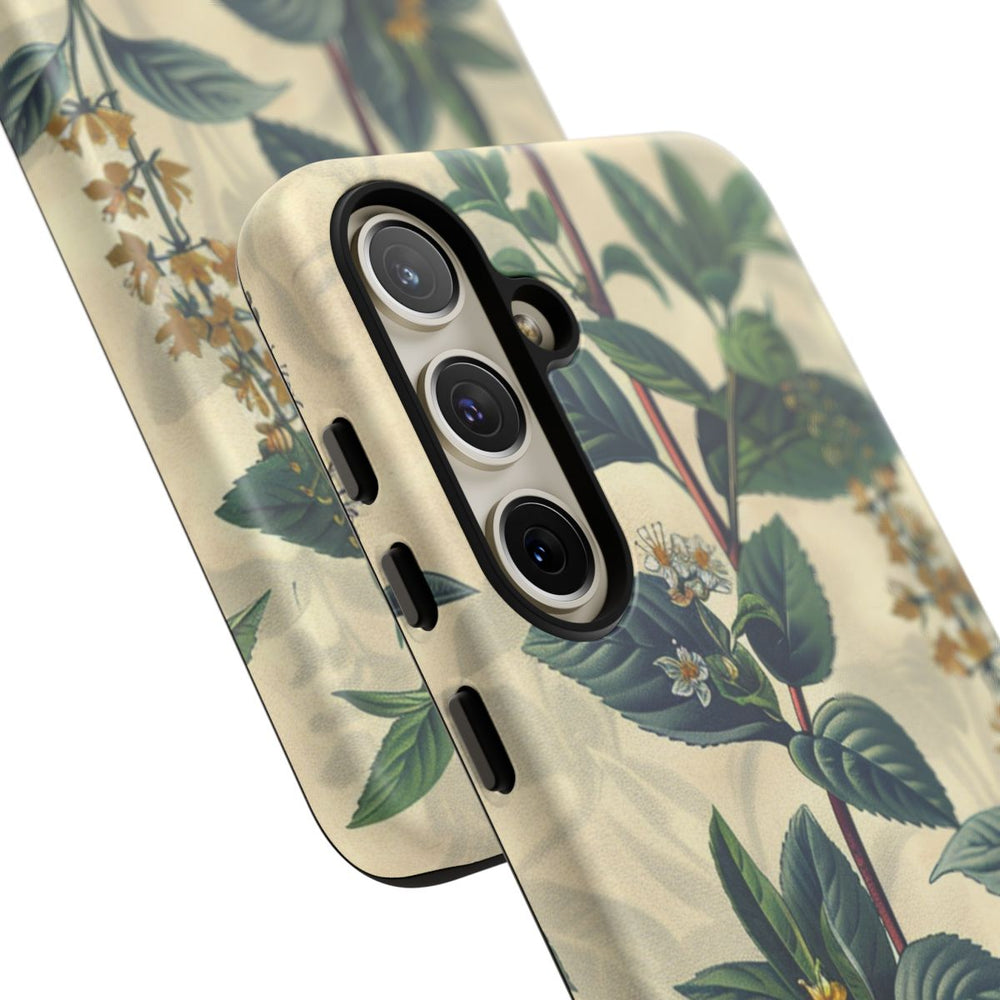 Dit hoesje is voorzien van een naadloos vintage botanisch patroon met gedetailleerde illustraties van groene bladeren en diverse kleine bloemen in witte, gele en blauwe tinten. De zachte beige achtergrond versterkt het natuurlijke en klassieke karakter van het ontwerp. Het motief loopt door over het hele oppervlak, wat zorgt voor een harmonieus en elegant geheel. Het matte, stevige hoesje is gemaakt van duurzaam polycarbonaat met een TPU-voering en biedt uitstekende bescherming en ondersteuning voor draadloos opladen.