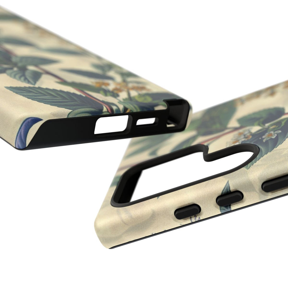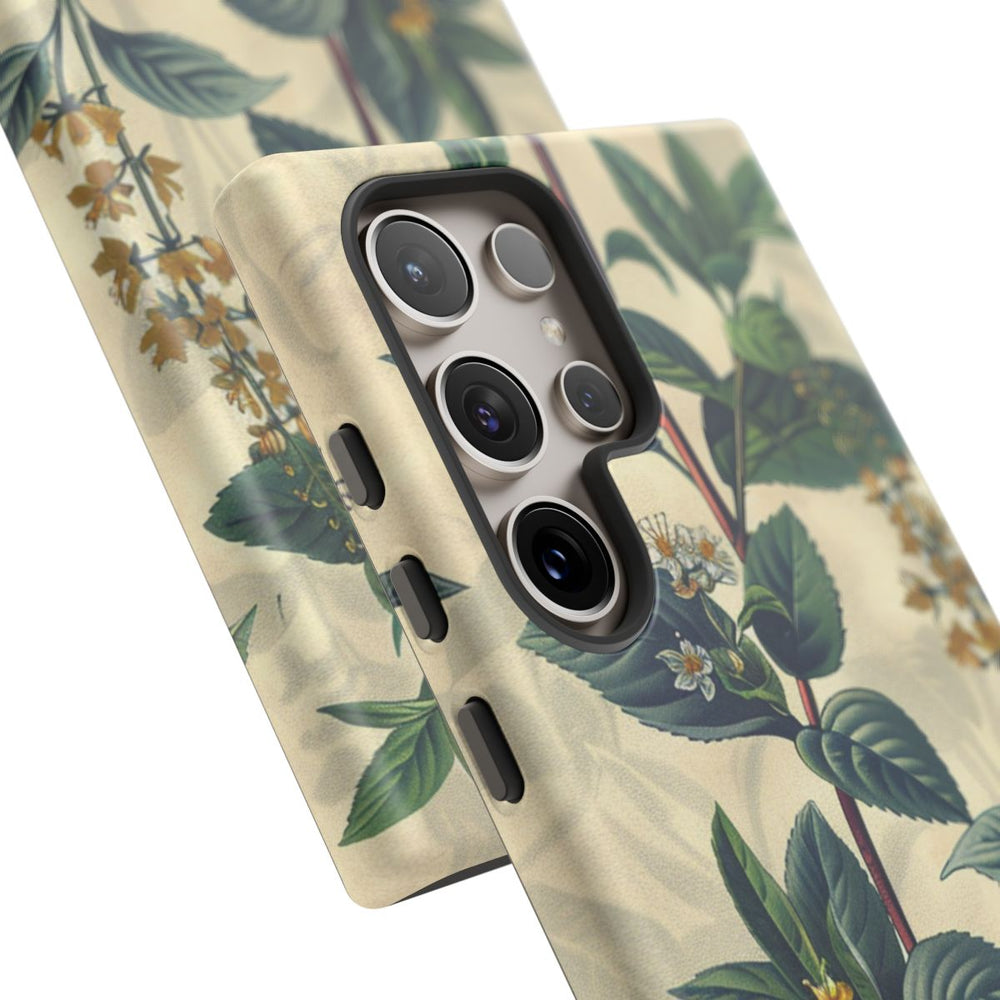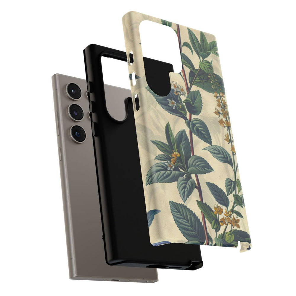 Dit hoesje is voorzien van een naadloos vintage botanisch patroon met gedetailleerde illustraties van groene bladeren en diverse kleine bloemen in witte, gele en blauwe tinten. De zachte beige achtergrond versterkt het natuurlijke en klassieke karakter van het ontwerp. Het motief loopt door over het hele oppervlak, wat zorgt voor een harmonieus en elegant geheel. Het matte, stevige hoesje is gemaakt van duurzaam polycarbonaat met een TPU-voering en biedt uitstekende bescherming en ondersteuning voor draadloos opladen.