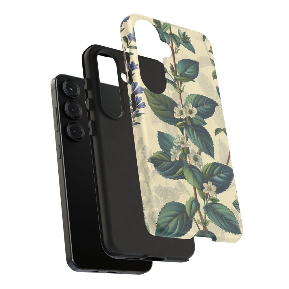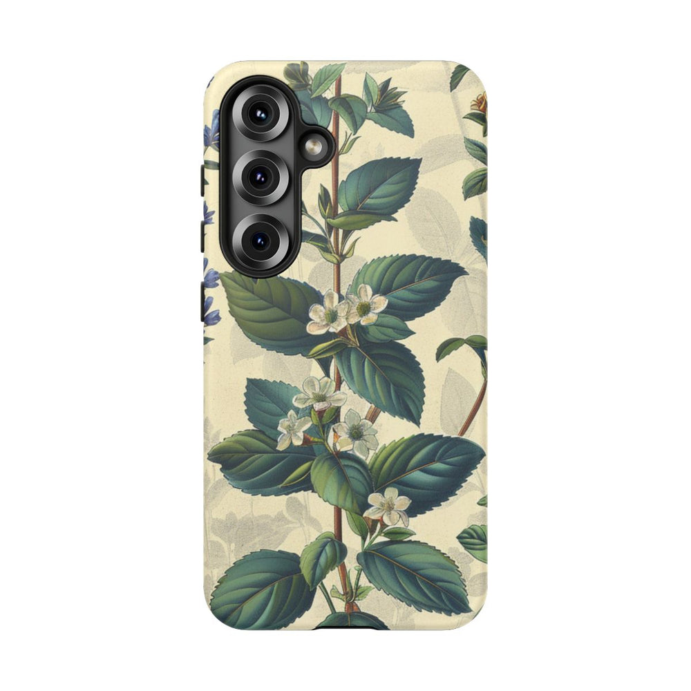 Dit hoesje is voorzien van een naadloos vintage botanisch patroon met gedetailleerde illustraties van verschillende kruiden. Het ontwerp toont groene bladeren en kleine bloemen in wit-, blauw- en geeltinten op een beige achtergrond. De klassieke, natuurlijke stijl met fijne lijnen en schaduwen geeft het hoesje een tijdloze uitstraling. Het stevige, matte hoesje bestaat uit twee lagen van polycarbonaat en TPU voor extra duurzaamheid en bescherming, en is geschikt voor draadloos opladen.