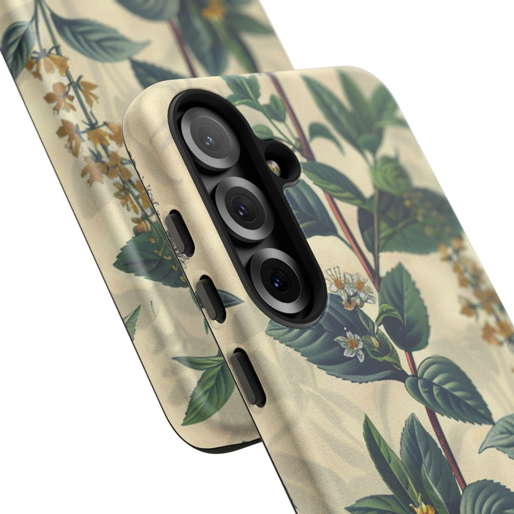 Dit hoesje is voorzien van een naadloos vintage botanisch patroon met gedetailleerde illustraties van groene bladeren en diverse kleine bloemen in witte, gele en blauwe tinten. De zachte beige achtergrond versterkt het natuurlijke en klassieke karakter van het ontwerp. Het motief loopt door over het hele oppervlak, wat zorgt voor een harmonieus en elegant geheel. Het matte, stevige hoesje is gemaakt van duurzaam polycarbonaat met een TPU-voering en biedt uitstekende bescherming en ondersteuning voor draadloos opladen.
