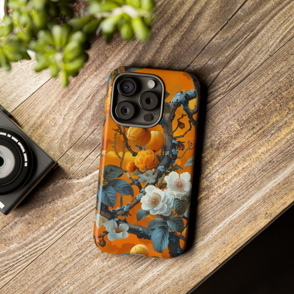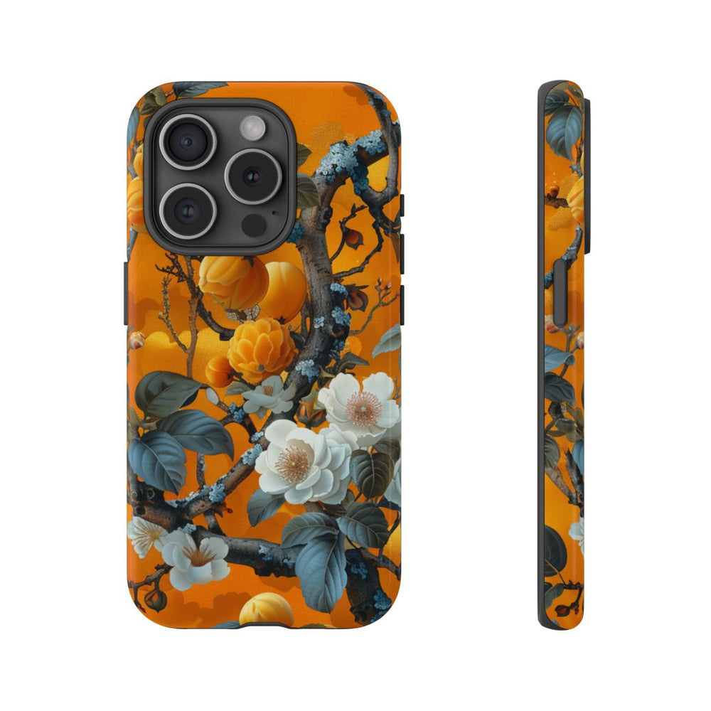 Dit hoesje is voorzien van een naadloos vintage botanisch patroon met gedetailleerde takken, bladeren en bloemen. De achtergrond heeft een diepe oranje kleur, waardoor de oranje en witte bloemen met donkergroene bladeren extra opvallen. De takken zijn afgewerkt met een subtiele textuur en blauwgrijze korstmossen. Het patroon wordt herhaald voor een doorlopend effect. Het hoesje is glanzend en stevig, gemaakt van polycarbonaat met een TPU-voering voor dubbele bescherming. Geschikt voor draadloos opladen.