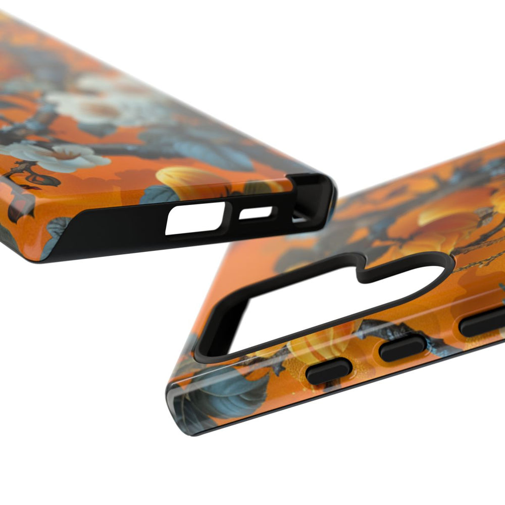 Dit hoesje is voorzien van een naadloos vintage botanisch patroon met gedetailleerde takken, bladeren en bloemen. De achtergrond heeft een diepe oranje kleur, waardoor de oranje en witte bloemen met donkergroene bladeren extra opvallen. De takken zijn afgewerkt met een subtiele textuur en blauwgrijze korstmossen. Het patroon wordt herhaald voor een doorlopend effect. Het hoesje is glanzend en stevig, gemaakt van polycarbonaat met een TPU-voering voor dubbele bescherming. Geschikt voor draadloos opladen.