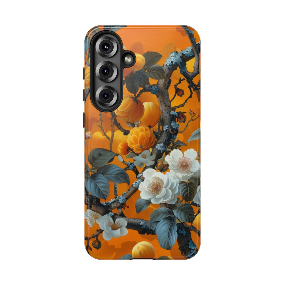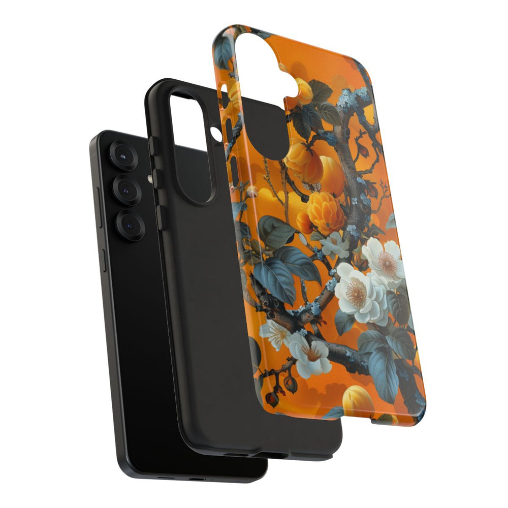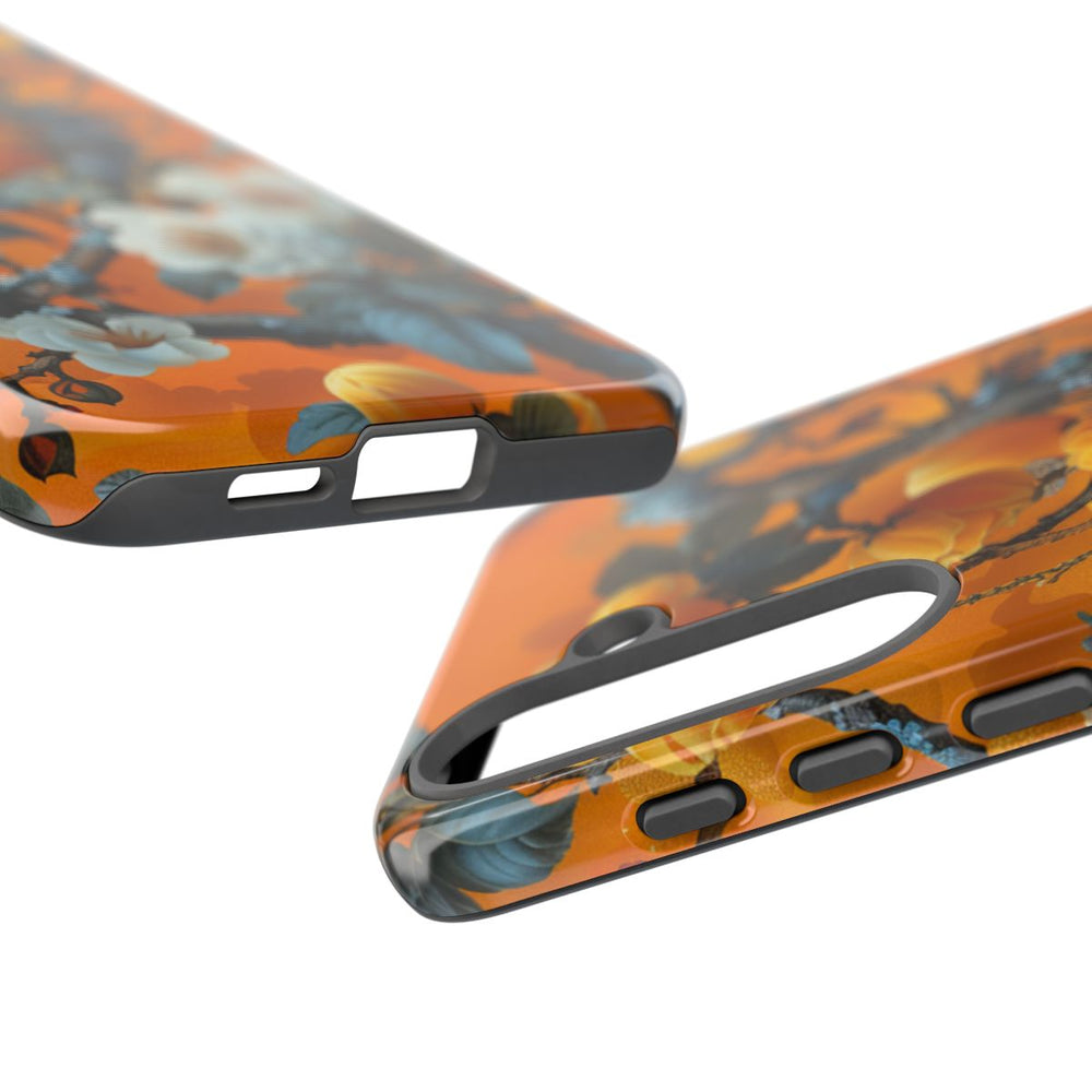 Dit hoesje is voorzien van een naadloos vintage botanisch patroon met gedetailleerde takken, bladeren en bloemen. De achtergrond heeft een diepe oranje kleur, waardoor de oranje en witte bloemen met donkergroene bladeren extra opvallen. De takken zijn afgewerkt met een subtiele textuur en blauwgrijze korstmossen. Het patroon wordt herhaald voor een doorlopend effect. Het hoesje is glanzend en stevig, gemaakt van polycarbonaat met een TPU-voering voor dubbele bescherming. Geschikt voor draadloos opladen.