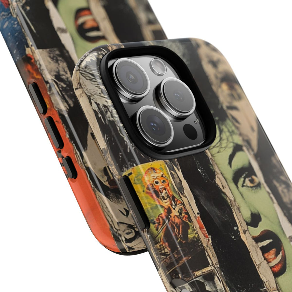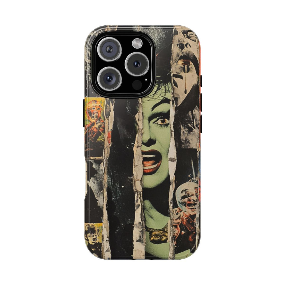 Dit telefoonhoesje heeft een opvallend ontwerp met een collage van verticaal geplaatste, gescheurde papieren stroken. Op elke strook staan afbeeldingen met een klassiek horror-thema, waaronder verschillende bekende horrorgezichten en wezens. Sommige afbeeldingen zijn in zwart-wit, andere in gedempte kleuren zoals groen, oranje en blauw. De gescheurde randen en de gelaagde texturen geven het hoesje een verweerde, retro uitstraling. Het hoesje bestaat uit twee lagen van polycarbonaat en TPU, wat zorgt voor extra stevigheid en bescherming. Het is bestand tegen dagelijks gebruik, geschikt voor buiten en ondersteunt draadloos opladen.