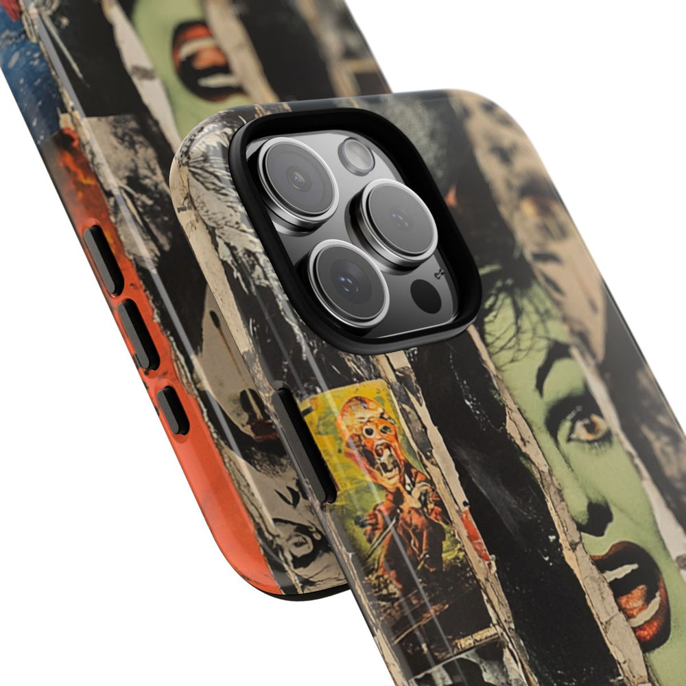 Dit telefoonhoesje heeft een opvallend ontwerp met een collage van verticaal geplaatste, gescheurde papieren stroken. Op elke strook staan afbeeldingen met een klassiek horror-thema, waaronder verschillende bekende horrorgezichten en wezens. Sommige afbeeldingen zijn in zwart-wit, andere in gedempte kleuren zoals groen, oranje en blauw. De gescheurde randen en de gelaagde texturen geven het hoesje een verweerde, retro uitstraling. Het hoesje bestaat uit twee lagen van polycarbonaat en TPU, wat zorgt voor extra stevigheid en bescherming. Het is bestand tegen dagelijks gebruik, geschikt voor buiten en ondersteunt draadloos opladen.