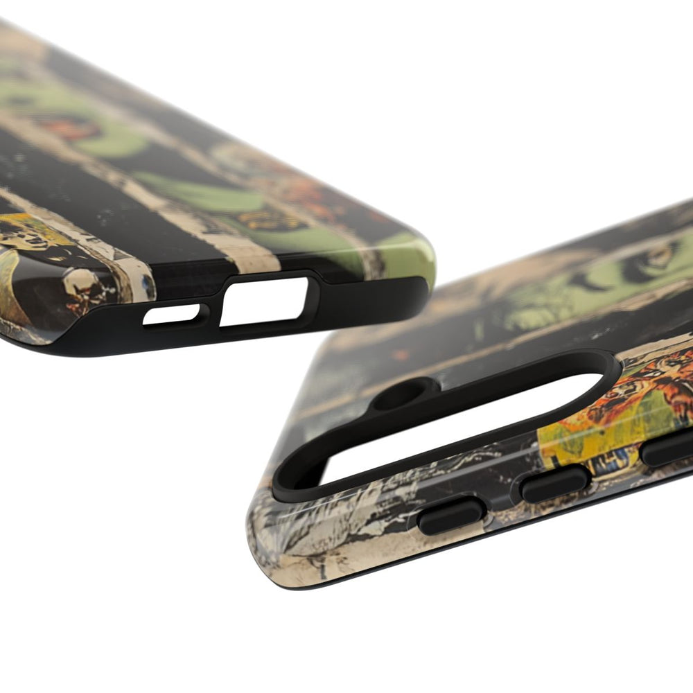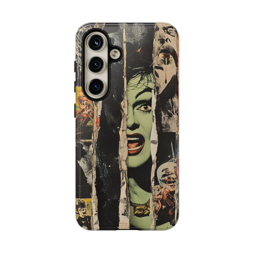 Dit telefoonhoesje heeft een opvallend ontwerp met een collage van verticaal geplaatste, gescheurde papieren stroken. Op elke strook staan afbeeldingen met een klassiek horror-thema, waaronder verschillende bekende horrorgezichten en wezens. Sommige afbeeldingen zijn in zwart-wit, andere in gedempte kleuren zoals groen, oranje en blauw. De gescheurde randen en de gelaagde texturen geven het hoesje een verweerde, retro uitstraling. Het hoesje bestaat uit twee lagen van polycarbonaat en TPU, wat zorgt voor extra stevigheid en bescherming. Het is bestand tegen dagelijks gebruik, geschikt voor buiten en ondersteunt draadloos opladen.