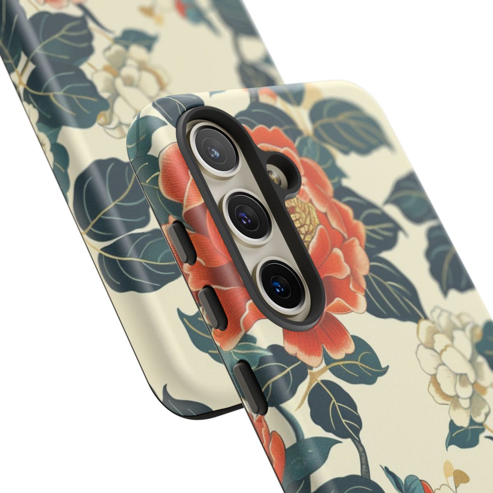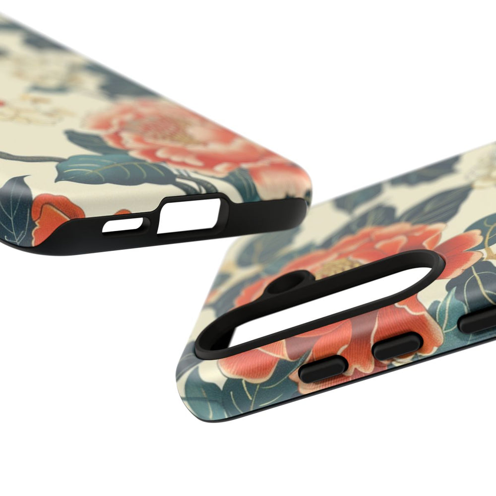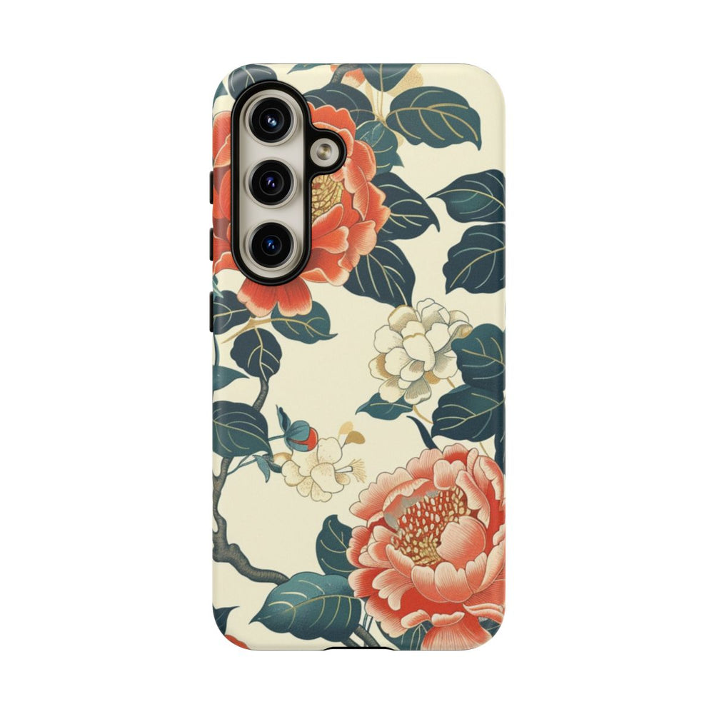 Dit telefoonhoesje is voorzien van een naadloos patroon met grote, gedetailleerde pioenrozen in rode en witte tinten, waarbij de bloemblaadjes en meeldraden prachtig zijn uitgewerkt. Donkergroene bladeren met zichtbare nerven omringen de bloemen en zijn verbonden door sierlijke, bruine takken. De zachte beige achtergrond geeft het geheel een klassieke, vintage uitstraling. Het matte hoesje heeft een stevige dubbele laag met een polycarbonaat buitenkant en TPU-binnenzijde, waardoor je toestel optimaal beschermd is. Het hoesje ondersteunt draadloos opladen en is bestand tegen invloeden van buitenaf.