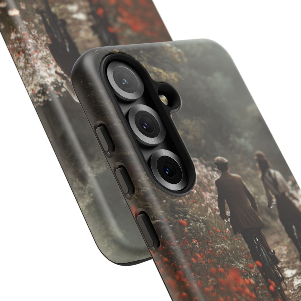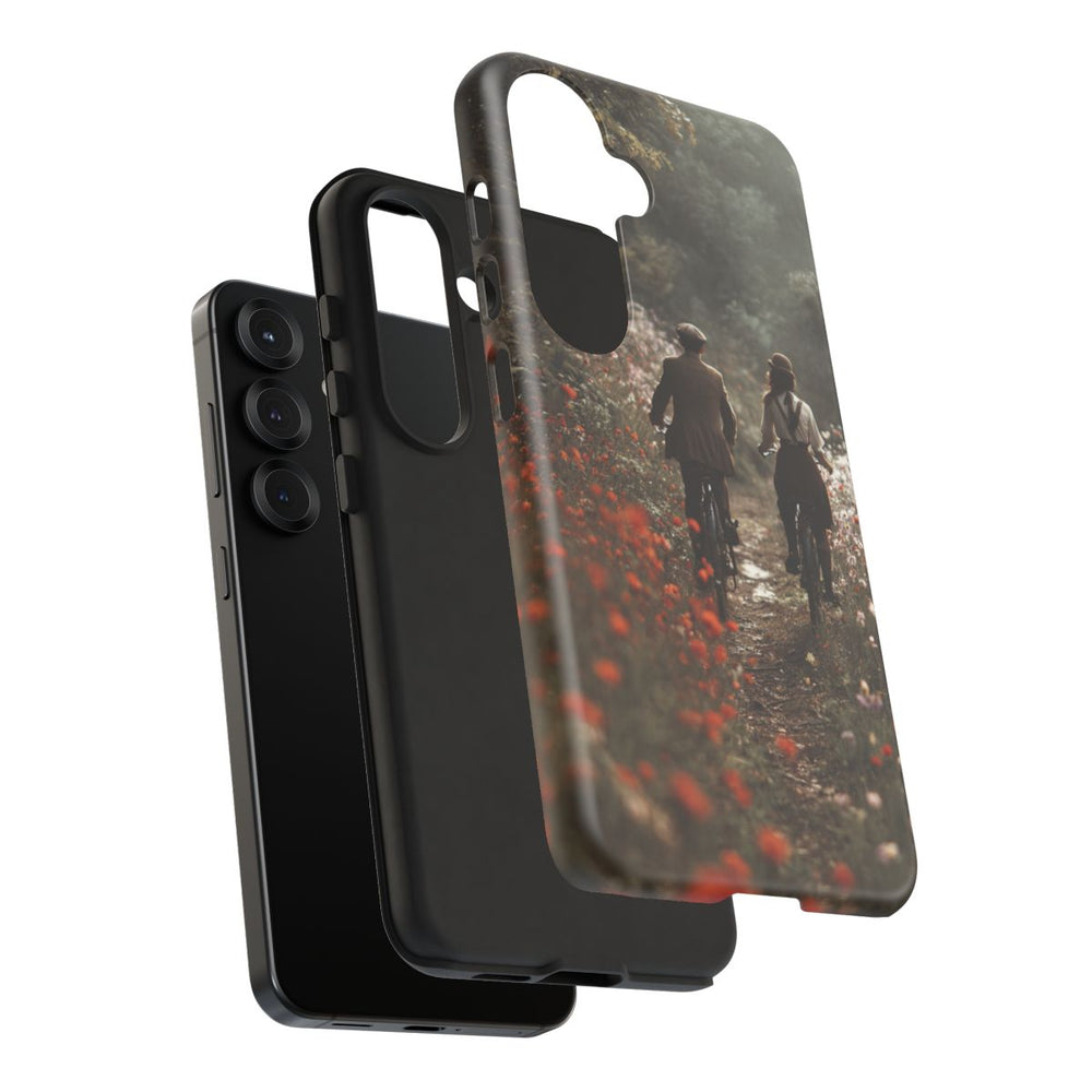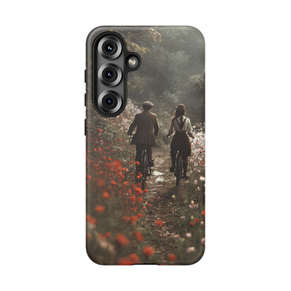 Dit hoesje toont een romantisch tafereel van een stelletje in vintage stijl dat samen fietst over een smal zandpad, omringd door kleurrijke wilde bloemen. De omgeving bestaat uit een weelderig groen bos met hoge bomen en zacht, diffuus licht, wat zorgt voor een dromerige sfeer. Het stel draagt kleding uit vroegere tijden, zoals hoeden en bretels, wat het geheel een nostalgisch karakter geeft. Het hoesje heeft een stevige dubbele laag met een polycarbonaat buitenkant en een TPU-binnenzijde, wat zorgt voor extra stevigheid en bescherming. Bovendien is het hoesje geschikt voor draadloos opladen.