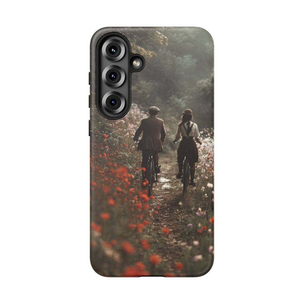 Dit hoesje toont een romantisch tafereel van een stelletje in vintage stijl dat samen fietst over een smal zandpad, omringd door kleurrijke wilde bloemen. De omgeving bestaat uit een weelderig groen bos met hoge bomen en zacht, diffuus licht, wat zorgt voor een dromerige sfeer. Het stel draagt kleding uit vroegere tijden, zoals hoeden en bretels, wat het geheel een nostalgisch karakter geeft. Het hoesje heeft een stevige dubbele laag met een polycarbonaat buitenkant en een TPU-binnenzijde, wat zorgt voor extra stevigheid en bescherming. Bovendien is het hoesje geschikt voor draadloos opladen.