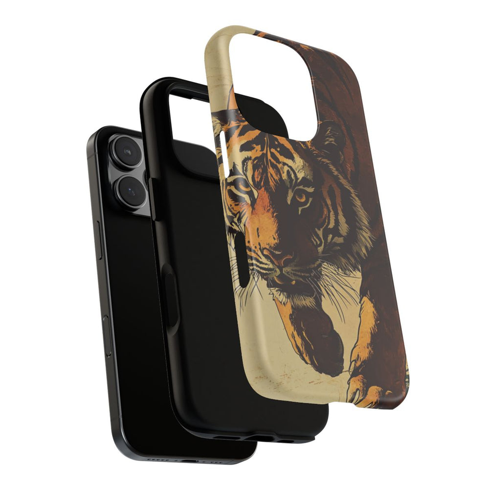 Dit hoesje is voorzien van een gedetailleerde illustratie van een tijger die naar voren loopt. De tijger is afgebeeld met opvallende zwarte strepen op een oranje en beige vacht, met witte accenten rond zijn gezicht en snorharen. De achtergrond heeft een verweerde, getextureerde uitstraling in gedempte beige en donkergroene tinten, wat het geheel een vintage en filmisch karakter geeft. De afbeelding is gedrukt op een mat telefoonhoesje van polycarbonaat en TPU, dat bestaat uit twee beschermende lagen en geschikt is voor draadloos opladen.