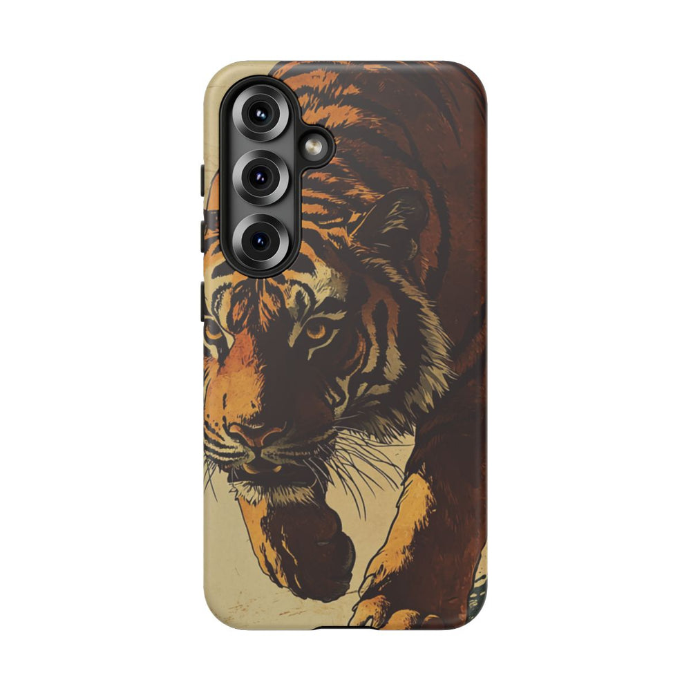 Dit hoesje is voorzien van een gedetailleerde illustratie van een tijger die naar voren loopt. De tijger is afgebeeld met opvallende zwarte strepen op een oranje en beige vacht, met witte accenten rond zijn gezicht en snorharen. De achtergrond heeft een verweerde, getextureerde uitstraling in gedempte beige en donkergroene tinten, wat het geheel een vintage en filmisch karakter geeft. De afbeelding is gedrukt op een mat telefoonhoesje van polycarbonaat en TPU, dat bestaat uit twee beschermende lagen en geschikt is voor draadloos opladen.