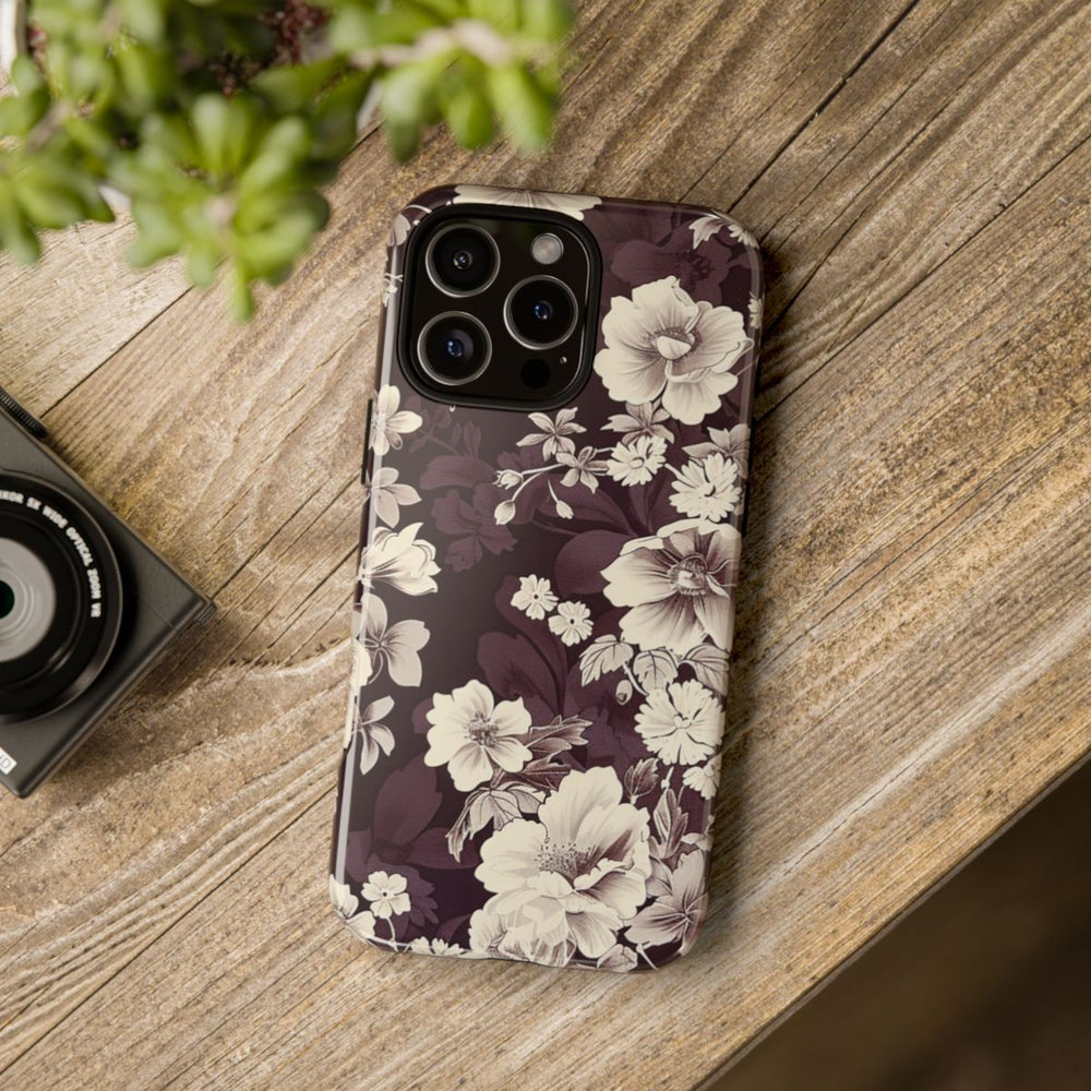 Dit telefoonhoesje heeft een vintage bloemenpatroon met grote en kleine witte bloemen en gedetailleerde bladeren op een donkerpaarse achtergrond. De bloemen en het blad zijn fijn geïllustreerd met schaduwen, wat zorgt voor diepte en structuur. Het patroon is dicht, maar evenwichtig, waardoor het hoesje een elegante en klassieke uitstraling krijgt. Dit glanzende, stevige hoesje bestaat uit een dubbele laag met een polycarbonaat buitenkant en een TPU-binnenkant. Zo biedt het extra stevigheid en bescherming, terwijl draadloos opladen mogelijk blijft.