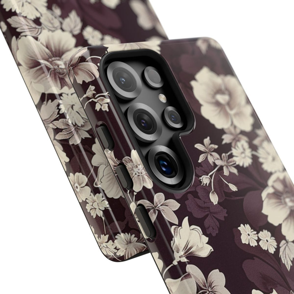 Dit telefoonhoesje heeft een vintage bloemenpatroon met grote en kleine witte bloemen en gedetailleerde bladeren op een donkerpaarse achtergrond. De bloemen en het blad zijn fijn geïllustreerd met schaduwen, wat zorgt voor diepte en structuur. Het patroon is dicht, maar evenwichtig, waardoor het hoesje een elegante en klassieke uitstraling krijgt. Dit glanzende, stevige hoesje bestaat uit een dubbele laag met een polycarbonaat buitenkant en een TPU-binnenkant. Zo biedt het extra stevigheid en bescherming, terwijl draadloos opladen mogelijk blijft.