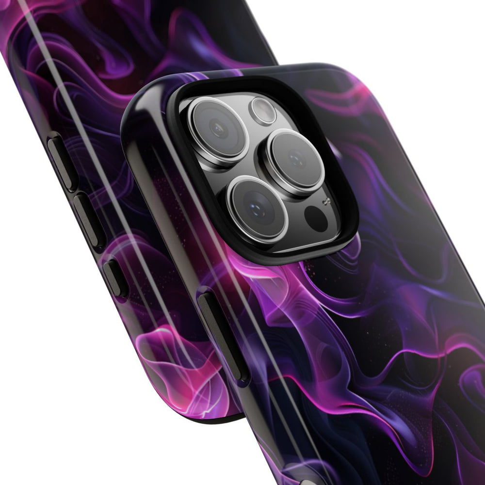 Dit ontwerp toont een doorlopend patroon van vloeiende, abstracte vlammen in tinten violet, roze en zwart. De vlammen ogen zacht en sierlijk, wat zorgt voor een dynamisch en bijna zwevend effect. De overwegend zwarte achtergrond laat de levendige kleuren extra opvallen. De afbeelding is gedrukt op een glanzend en stevig hoesje met een dubbele laag van polycarbonaat en TPU, wat zorgt voor extra stevigheid en bescherming. Het hoesje ondersteunt draadloos opladen en is bestand tegen weersinvloeden.