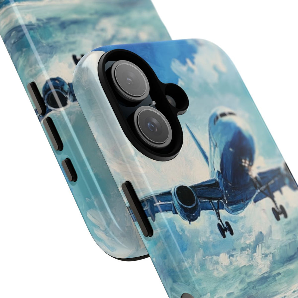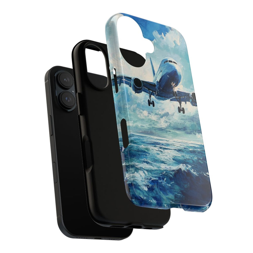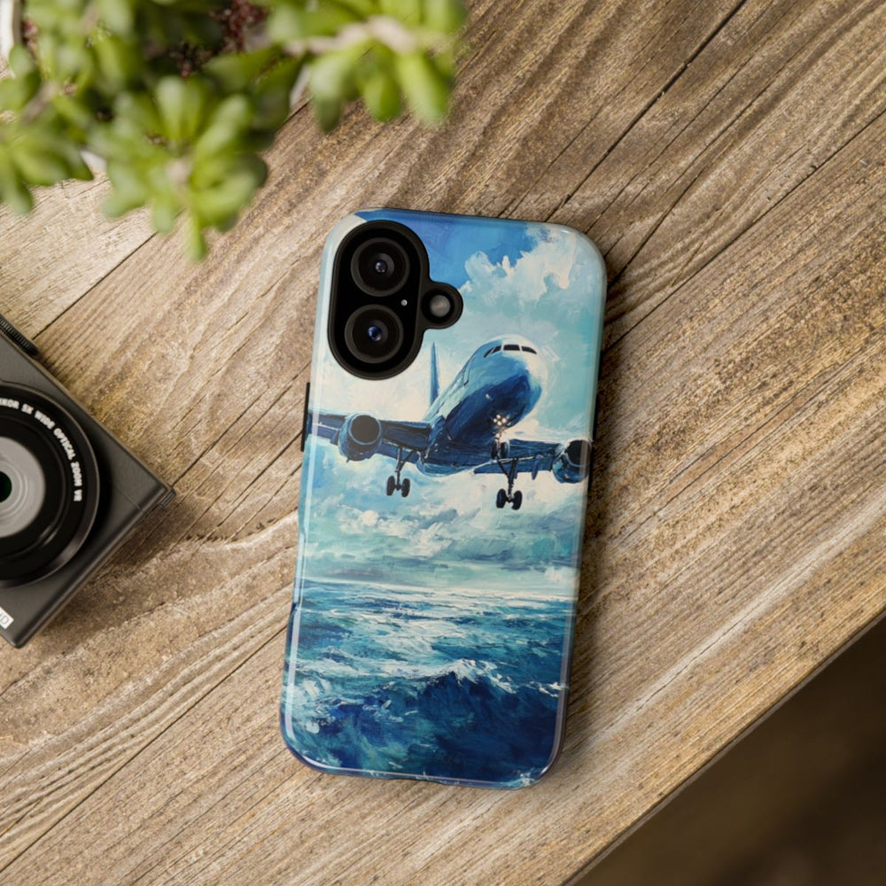 Dit hoesje toont een olieverfschilderij van een vliegtuig dat laag over een uitgestrekte oceaan vliegt. Het vliegtuig is van voren te zien met het landingsgestel uitgeklapt, tegen een indrukwekkende lucht vol met wolken. De oceaan eronder is afgebeeld met dynamische golven in verschillende tinten blauw en witte accenten. De afbeelding is gedrukt op een glanzend en stevig hoesje met een polycarbonaat buitenkant en TPU-binnenzijde, ontworpen voor duurzaamheid en bescherming buitenshuis. Ondersteunt draadloos opladen.