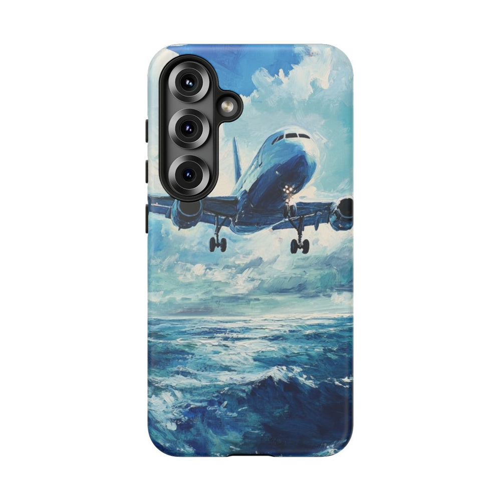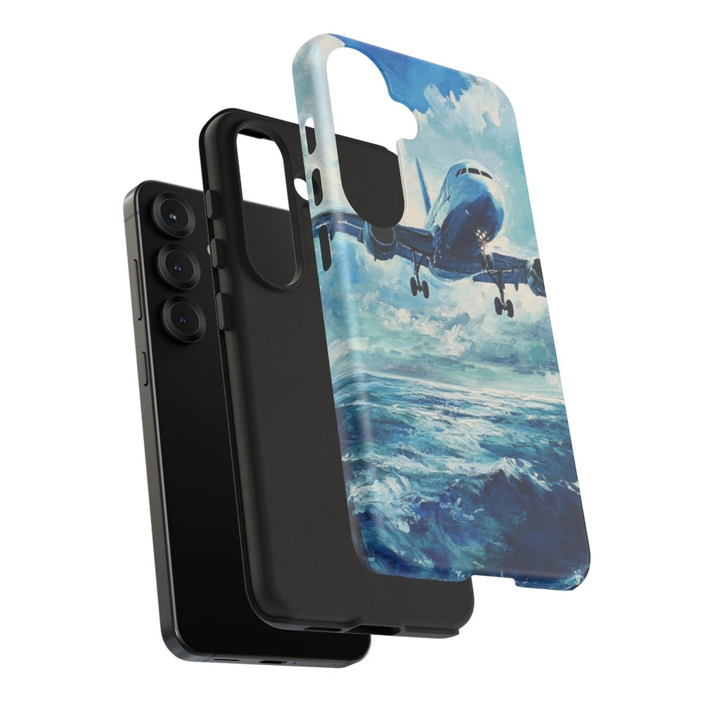 Dit hoesje toont een olieverfschilderij van een vliegtuig dat laag over een onstuimige oceaan vliegt. Het tafereel laat het vliegtuig van voren zien, met het landingsgestel uit, tegen een dramatische lucht met grote, opvallende wolken. De oceaan eronder wordt weergegeven met diepblauwe golven en witte accenten, wat een gevoel van beweging oproept. Het hoesje heeft een dubbele laag met een polycarbonaat buitenkant en TPU-binnenzijde, en ondersteunt draadloos opladen.