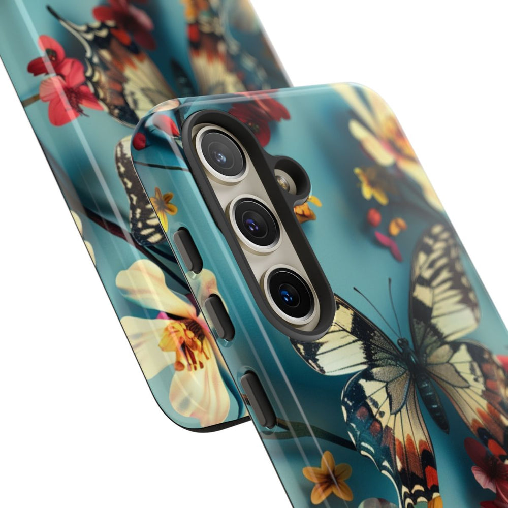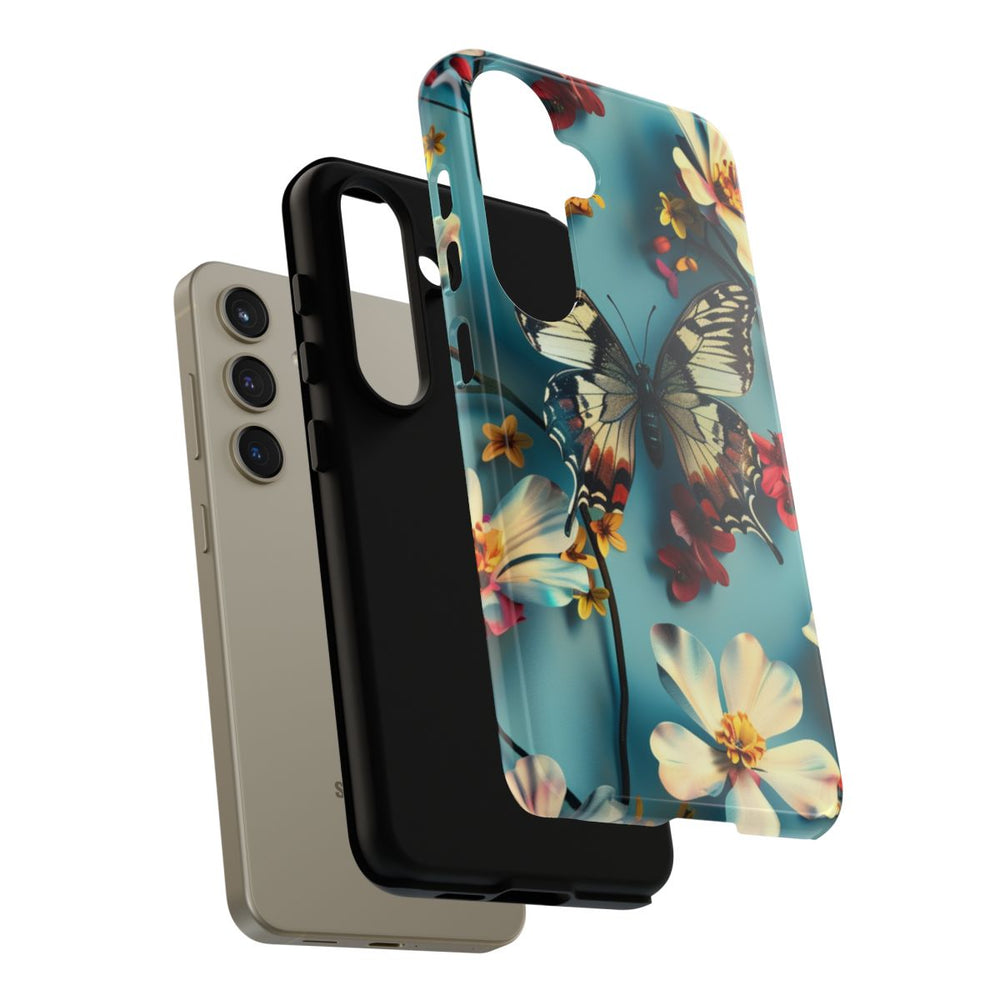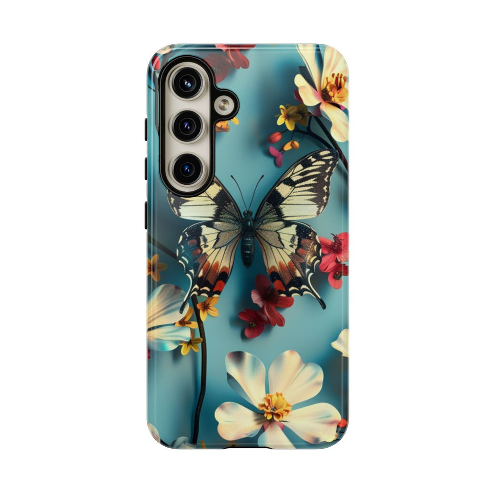 Dit hoesje heeft een gedetailleerde vlinder met zwart, witte en oranje vleugels, centraal geplaatst tussen verschillende bloemen. De bloemen zijn overwegend wit met gele harten, aangevuld met kleinere rode en gele bloesems. Dunne donkere stelen en knoppen lopen door het patroon, dat is afgewerkt met een gladde blauwe achtergrond. Het ontwerp heeft een 3D-effect, waardoor de vlinder en bloemen extra diepte krijgen. Het hoesje is glanzend en stevig, gemaakt van polycarbonaat en TPU, en biedt dubbele bescherming. Geschikt voor draadloos opladen.