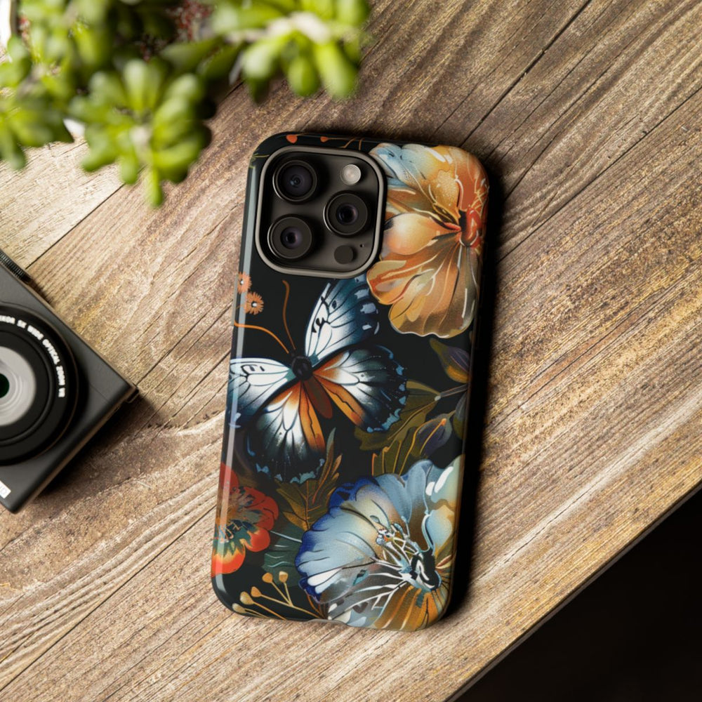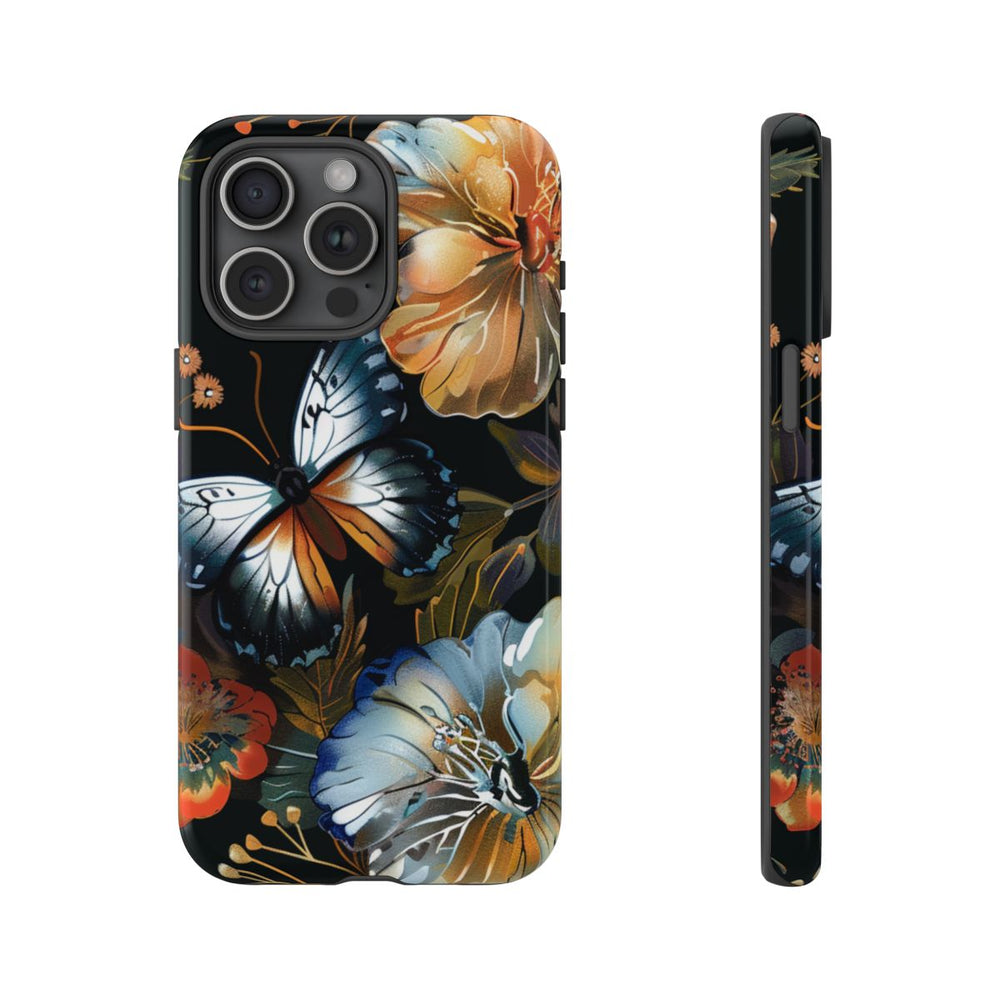 Dit hoesje heeft een naadloos patroon van grote, gedetailleerde bloemen en vlinders op een zwarte achtergrond. De bloemen zijn afgebeeld in tinten oranje, goud, crème en blauw, wat zorgt voor een levendige en elegante uitstraling. De vlinders vallen op door hun verfijnde vleugelpatronen in wit, zwart en oranje. Het patroon is verder versierd met sierlijke bladeren en kleine bloemelementen, wat een natuurlijke en artistieke sfeer geeft. Het hoesje is glanzend afgewerkt en gemaakt van stevige materialen met dubbele lagen, waardoor het extra bescherming biedt. Ondersteunt draadloos opladen.