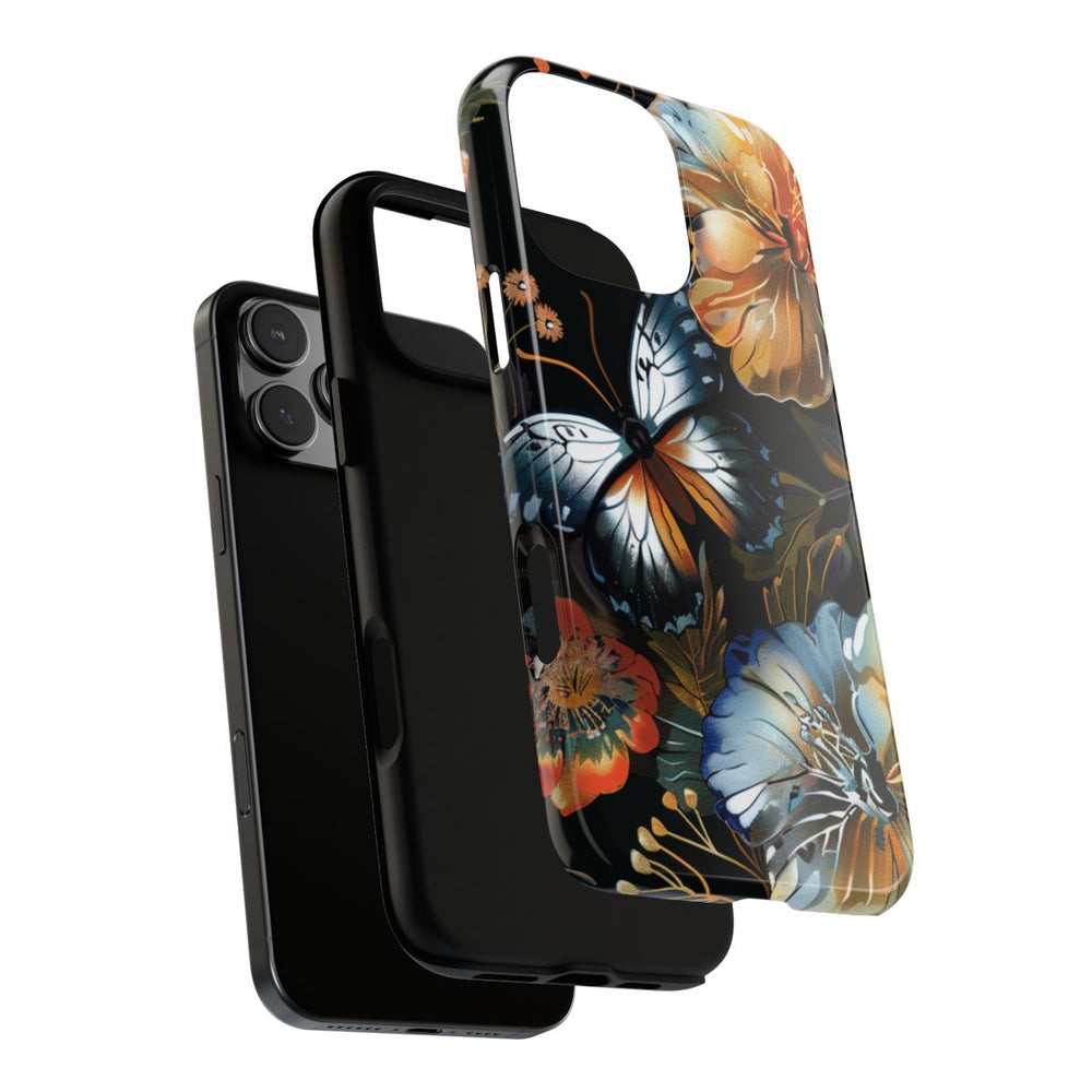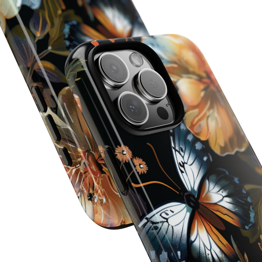 Dit hoesje heeft een naadloos patroon van grote, gedetailleerde bloemen en vlinders op een zwarte achtergrond. De bloemen zijn afgebeeld in tinten oranje, goud, crème en blauw, wat zorgt voor een levendige en elegante uitstraling. De vlinders vallen op door hun verfijnde vleugelpatronen in wit, zwart en oranje. Het patroon is verder versierd met sierlijke bladeren en kleine bloemelementen, wat een natuurlijke en artistieke sfeer geeft. Het hoesje is glanzend afgewerkt en gemaakt van stevige materialen met dubbele lagen, waardoor het extra bescherming biedt. Ondersteunt draadloos opladen.