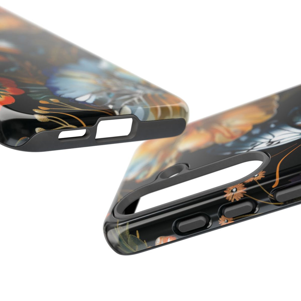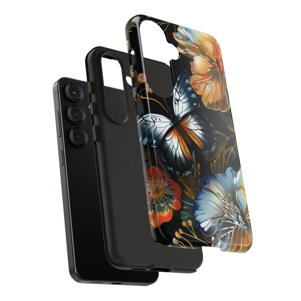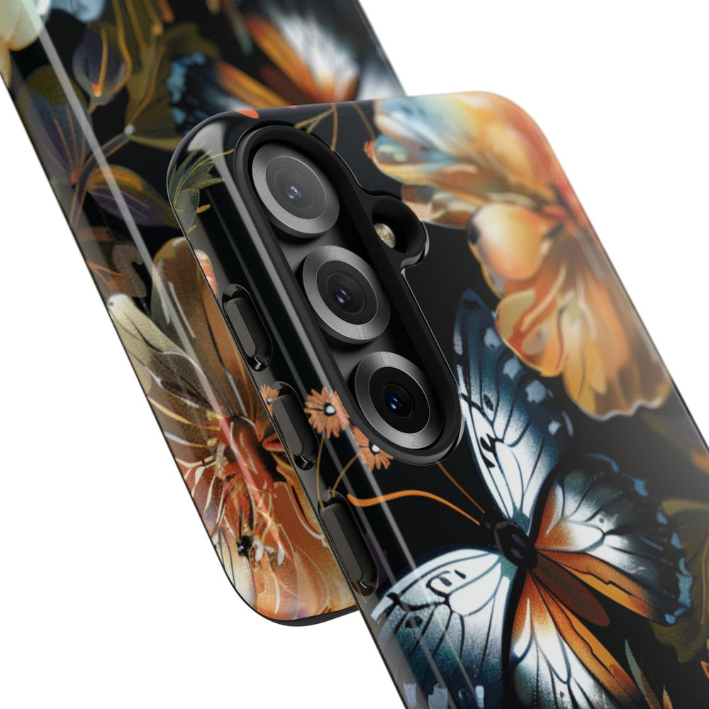 Dit hoesje heeft een naadloos patroon van grote, gedetailleerde bloemen en vlinders op een zwarte achtergrond. De bloemen zijn afgebeeld in tinten oranje, goud, crème en blauw, wat zorgt voor een levendige en elegante uitstraling. De vlinders vallen op door hun verfijnde vleugelpatronen in wit, zwart en oranje. Het patroon is verder versierd met sierlijke bladeren en kleine bloemelementen, wat een natuurlijke en artistieke sfeer geeft. Het hoesje is glanzend afgewerkt en gemaakt van stevige materialen met dubbele lagen, waardoor het extra bescherming biedt. Ondersteunt draadloos opladen.
