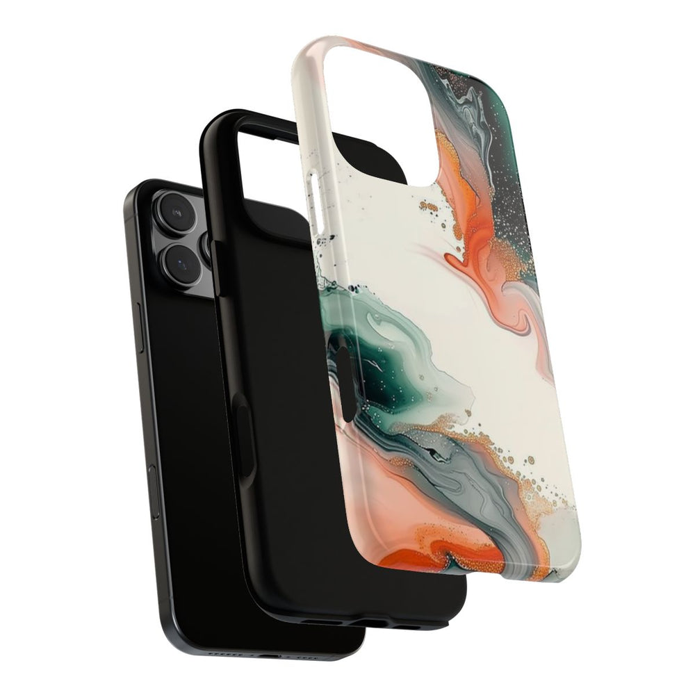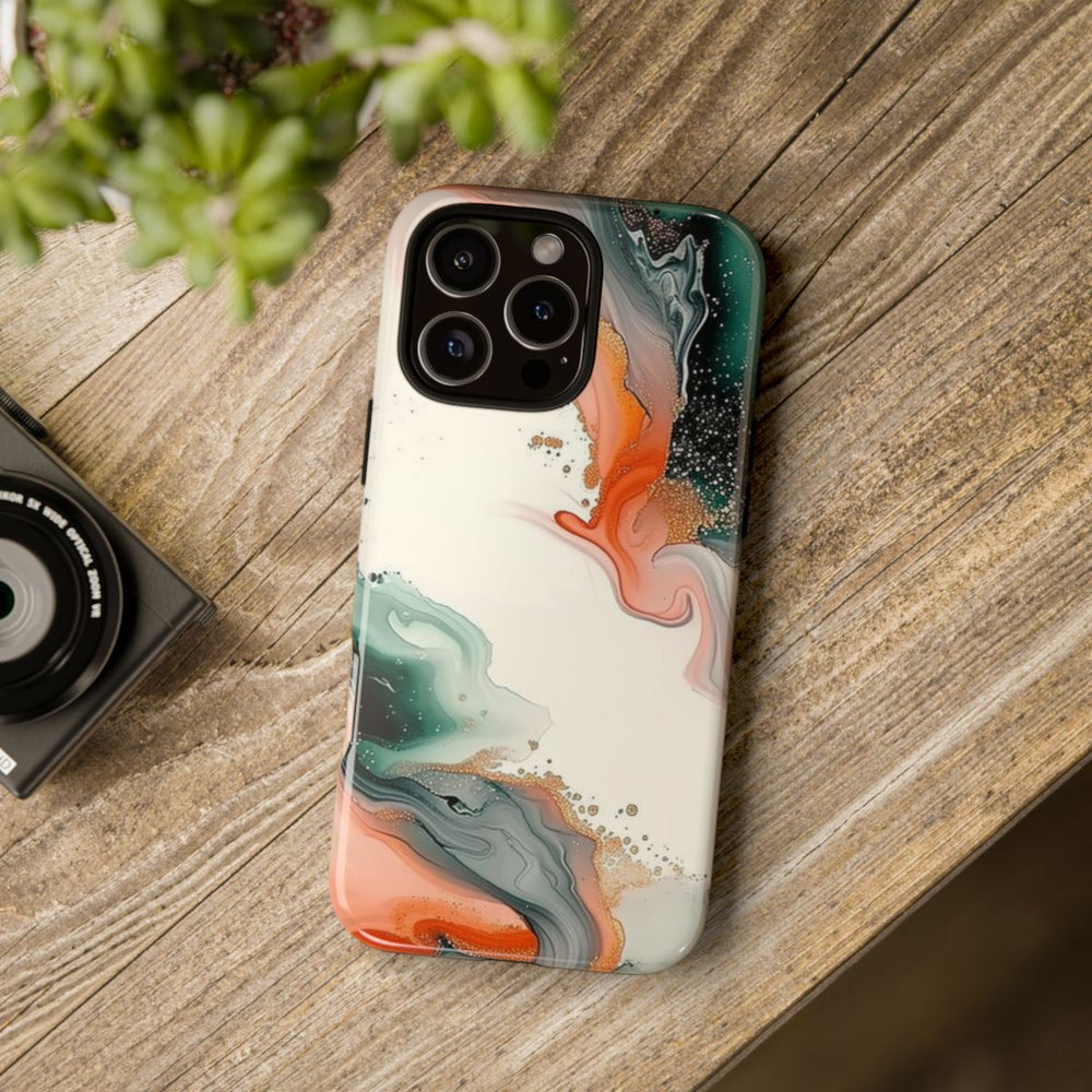 Dit hoesje heeft een abstract ontwerp met vloeiende krullen en golven in tinten groen, koraal, grijs en zwart op een witte achtergrond. De kleuren lopen soepel in elkaar over met zachte overgangen en organische vormen, afgewerkt met kleine belletjes en goudkleurige spikkels. Het geheel oogt dynamisch en geeft een gevoel van beweging en diepte. De afbeelding is gedrukt op een glanzend, stevig hoesje met een dubbele laag voor extra bescherming. Het hoesje ondersteunt draadloos opladen.