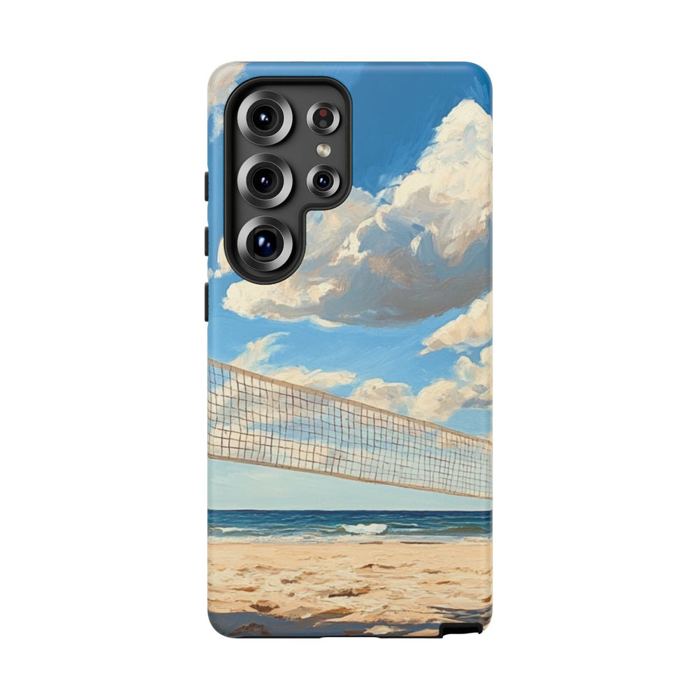 Deze afbeelding toont een volleybalnet dat is opgezet op een zandstrand met een helder uitzicht op de oceaan op de achtergrond. De lucht is felblauw met grote, witte wolken die verspreid zijn over de hemel. Het zand is licht van kleur en heeft een duidelijke structuur, terwijl de palen van het volleybalnet schaduwen werpen. Dit matte, stevige telefoonhoesje is gemaakt van polycarbonaat met een TPU-voering en biedt uitstekende bescherming en duurzaamheid, ideaal voor gebruik buitenshuis. Geschikt voor de Galaxy S25 Ultra.