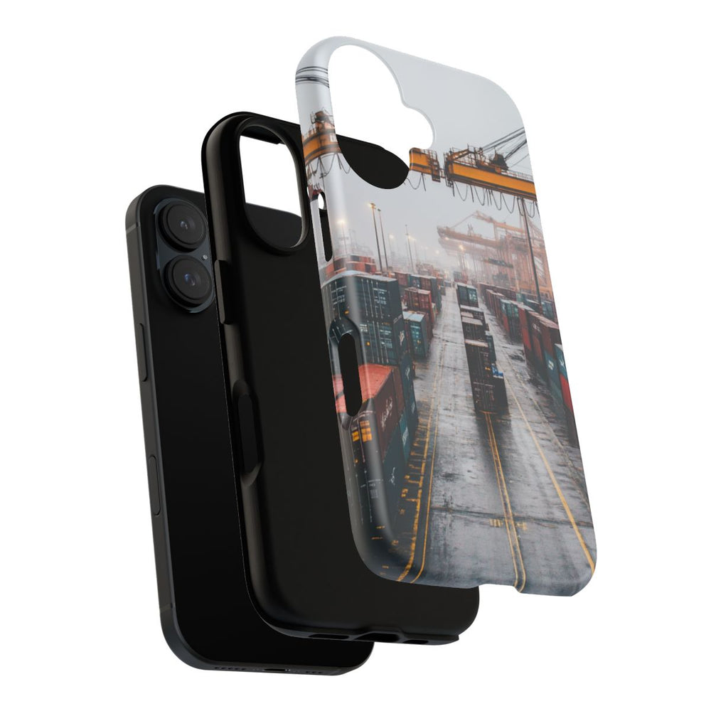 Dit hoesje toont een levendige zeehaven met talloze gestapelde vrachtcontainers in verschillende kleuren, voornamelijk donkerrood, blauw en groen. Grote gele kranen torenen boven de containers uit, klaar om vracht te verplaatsen. De natte ondergrond weerspiegelt de bewolkte lucht en het uitzicht reikt tot in de verte, waar nog meer kranen en containers zichtbaar zijn. Het hoesje heeft een dubbele laag met een matte afwerking en is gemaakt van polycarbonaat en TPU. Het is duurzaam, bestand tegen verschillende weersomstandigheden en geschikt voor draadloos opladen.