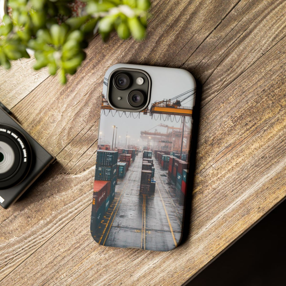 Dit hoesje toont een indrukwekkend beeld van een grote haven, waar rijen gestapelde vrachtcontainers in verschillende kleuren zoals rood, blauw en groen te zien zijn. Twee grote gele kranen domineren het industriële landschap en verplaatsen de containers. De natte ondergrond weerspiegelt de grijze, bewolkte lucht, wat het logistieke karakter van de omgeving benadrukt. Het ontwerp is gedrukt op een mat, stevig telefoonhoesje met een dubbele laag en ondersteuning voor draadloos opladen.