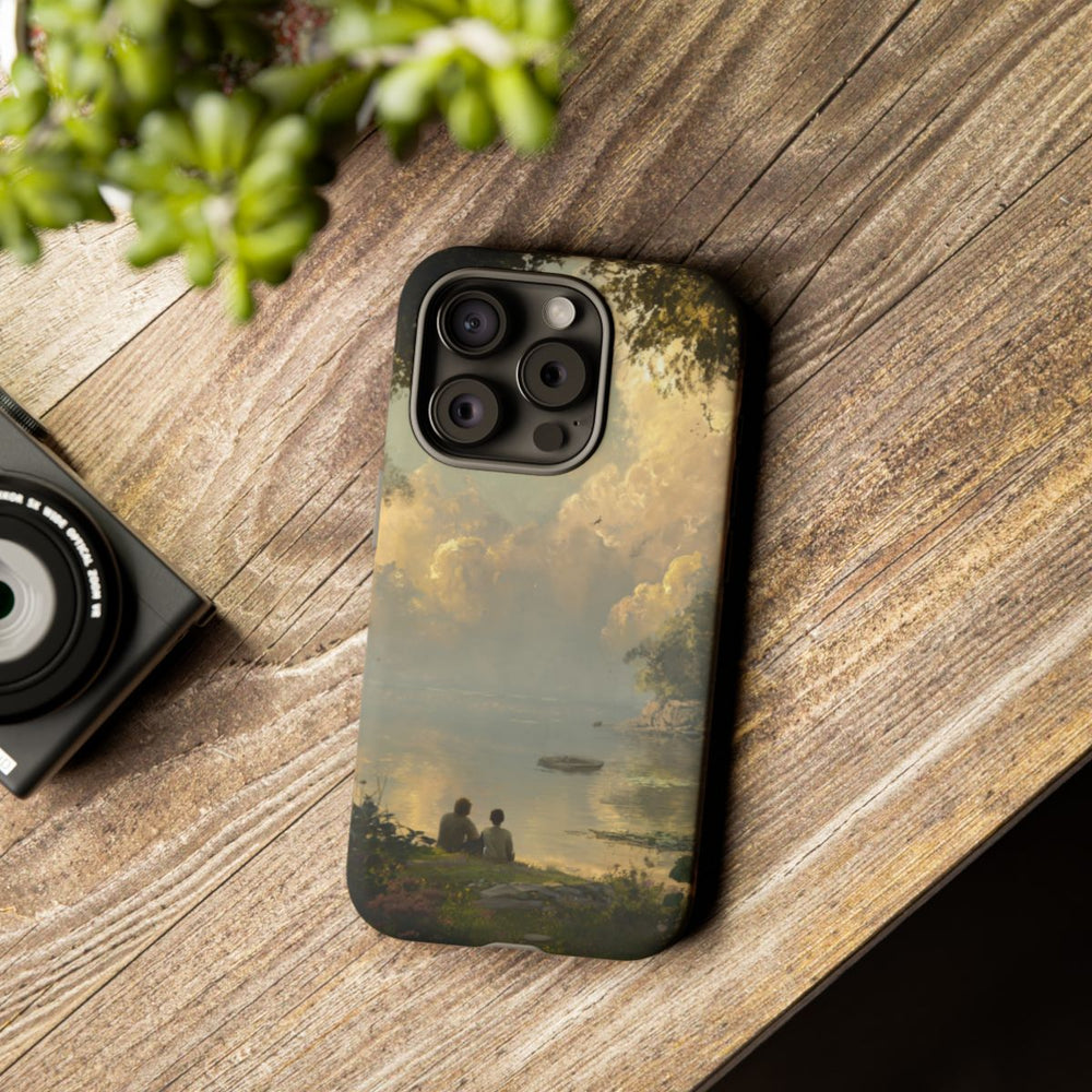 Dit ontwerp toont een rustgevend uitzicht over een meer, omringd door weelderige bomen en planten. Twee mensen zitten stil aan de oever in het gras en kijken uit over het kalme water waarin zachte, gouden wolken worden weerspiegeld. Een klein bootje drijft rustig op het meer en versterkt de serene sfeer. De scène is gehuld in warm, natuurlijk licht met diepe groentinten en aardse kleuren rondom het water. Deze afbeelding is gedrukt op een stevig mat hoesje met dubbele laag bescherming en ondersteuning voor draadloos opladen.