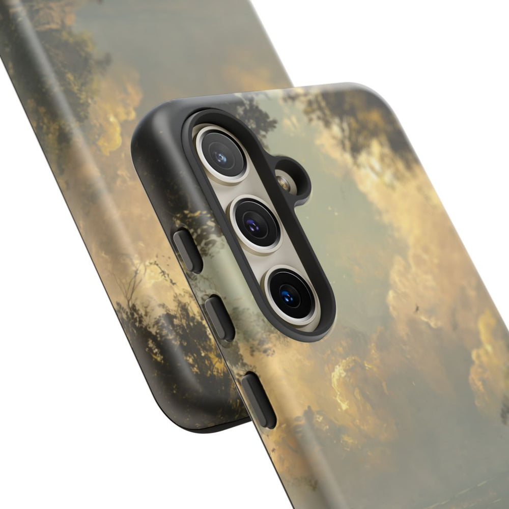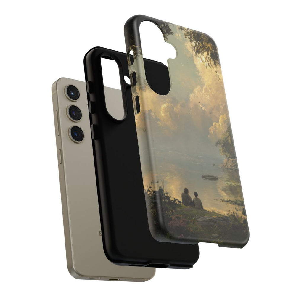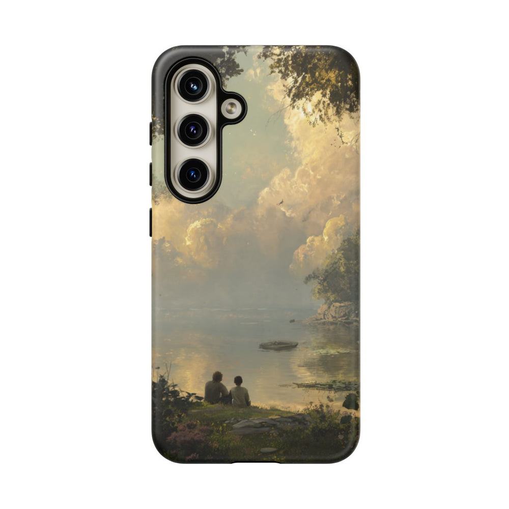 Dit ontwerp toont een rustgevend uitzicht over een meer, omringd door weelderige bomen en planten. Twee mensen zitten stil aan de oever in het gras en kijken uit over het kalme water waarin zachte, gouden wolken worden weerspiegeld. Een klein bootje drijft rustig op het meer en versterkt de serene sfeer. De scène is gehuld in warm, natuurlijk licht met diepe groentinten en aardse kleuren rondom het water. Deze afbeelding is gedrukt op een stevig mat hoesje met dubbele laag bescherming en ondersteuning voor draadloos opladen.