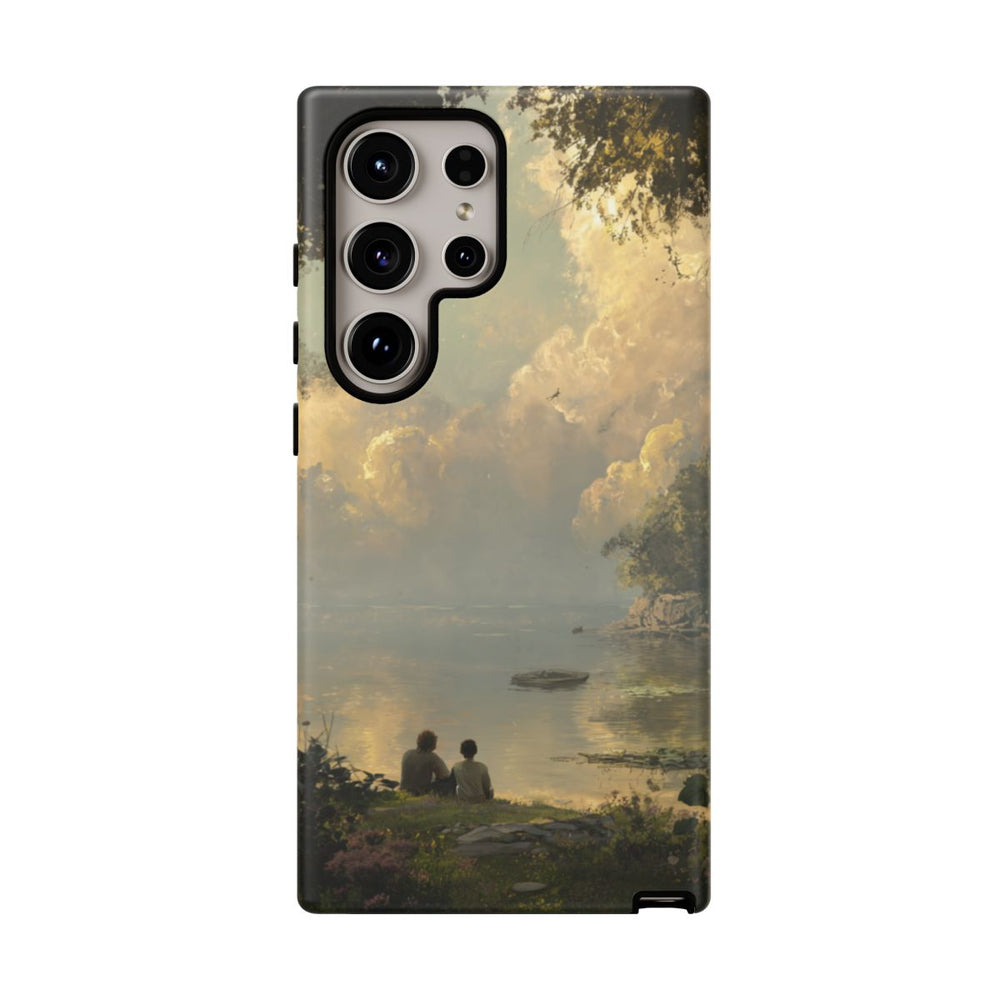 Dit ontwerp toont een rustgevend uitzicht over een meer, omringd door weelderige bomen en planten. Twee mensen zitten stil aan de oever in het gras en kijken uit over het kalme water waarin zachte, gouden wolken worden weerspiegeld. Een klein bootje drijft rustig op het meer en versterkt de serene sfeer. De scène is gehuld in warm, natuurlijk licht met diepe groentinten en aardse kleuren rondom het water. Deze afbeelding is gedrukt op een stevig mat hoesje met dubbele laag bescherming en ondersteuning voor draadloos opladen.