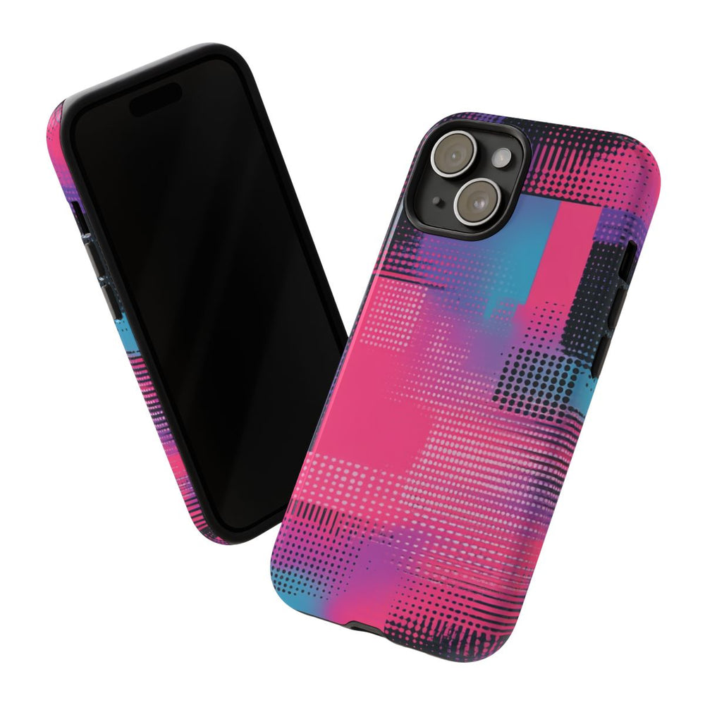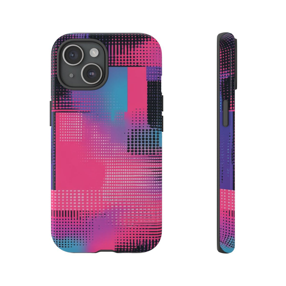 Dit hoesje is voorzien van een opvallend abstract geometrisch patroon in heldere tinten roze, paars, blauw en zwart. Het ontwerp bestaat uit diverse vormen, zoals vierkanten en rechthoeken, gecombineerd met gestippelde en gestreepte accenten voor een dynamische, moderne uitstraling. Het glanzende, stevige hoesje heeft een dubbele laag: een harde polycarbonaat buitenkant en een TPU binnenkant voor extra bescherming. Geschikt voor draadloos opladen en bestand tegen invloeden van buitenaf, terwijl de optische kwaliteit behouden blijft.