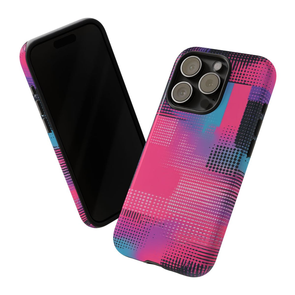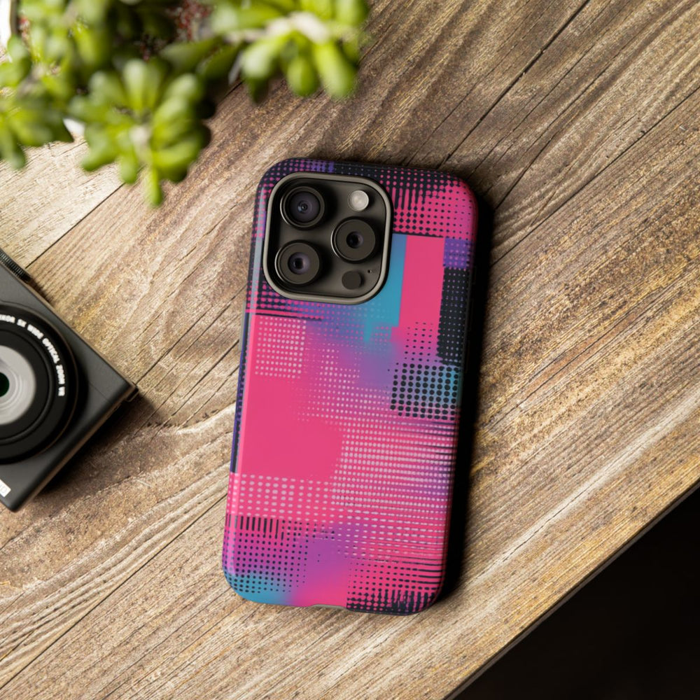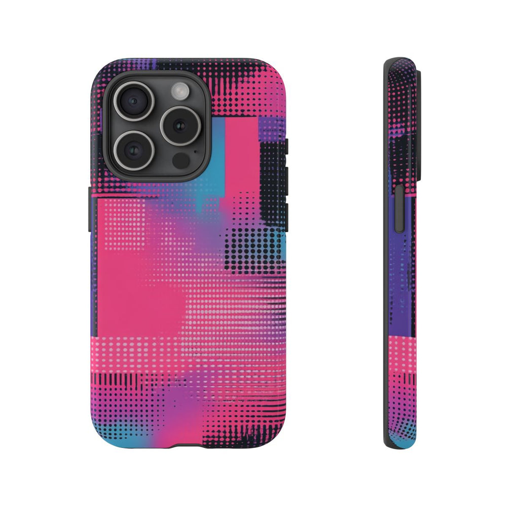 Dit hoesje is voorzien van een opvallend abstract geometrisch patroon in heldere tinten roze, paars, blauw en zwart. Het ontwerp bestaat uit diverse vormen, zoals vierkanten en rechthoeken, gecombineerd met gestippelde en gestreepte accenten voor een dynamische, moderne uitstraling. Het glanzende, stevige hoesje heeft een dubbele laag: een harde polycarbonaat buitenkant en een TPU binnenkant voor extra bescherming. Geschikt voor draadloos opladen en bestand tegen invloeden van buitenaf, terwijl de optische kwaliteit behouden blijft.