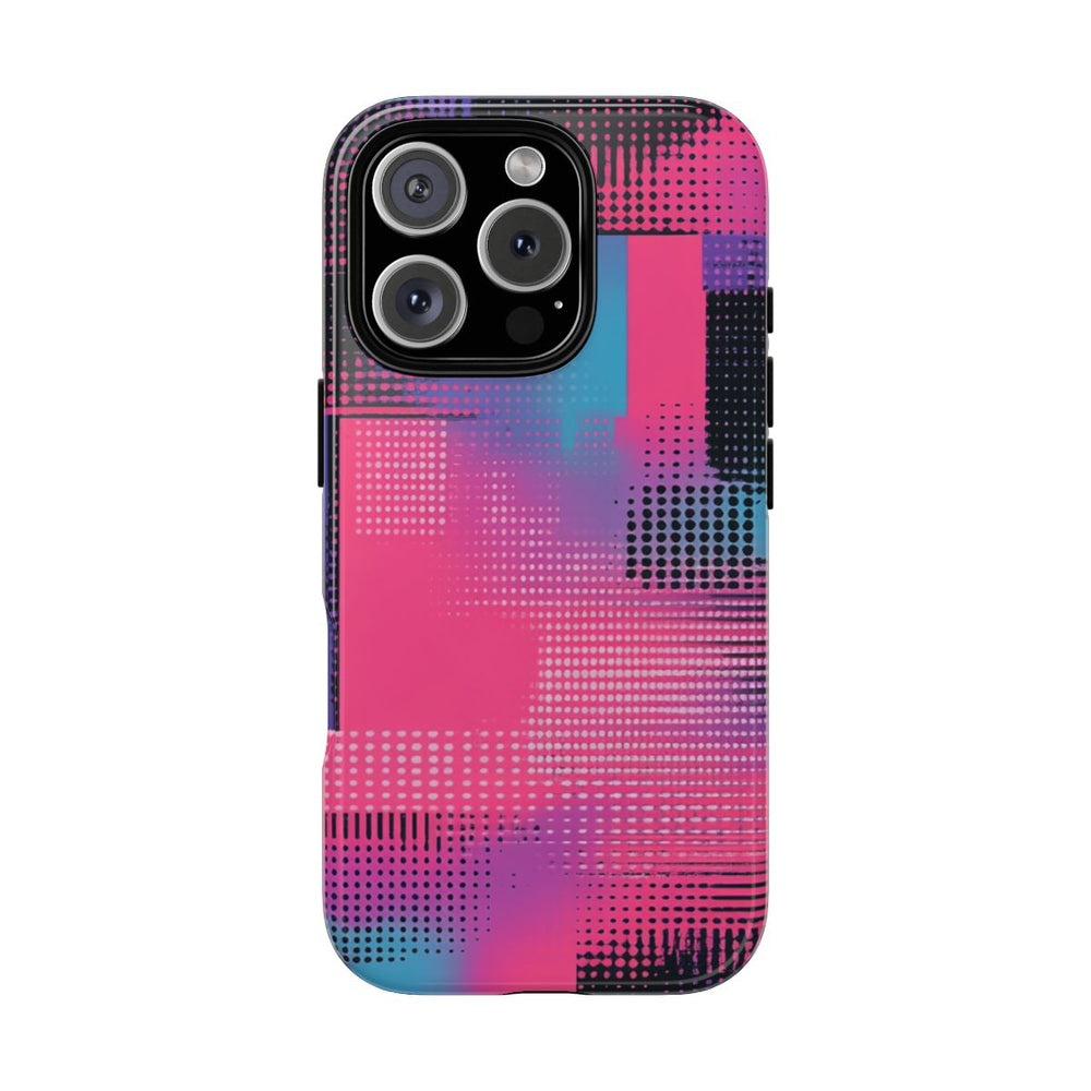 Dit hoesje is voorzien van een opvallend abstract geometrisch patroon in heldere tinten roze, paars, blauw en zwart. Het ontwerp bestaat uit diverse vormen, zoals vierkanten en rechthoeken, gecombineerd met gestippelde en gestreepte accenten voor een dynamische, moderne uitstraling. Het glanzende, stevige hoesje heeft een dubbele laag: een harde polycarbonaat buitenkant en een TPU binnenkant voor extra bescherming. Geschikt voor draadloos opladen en bestand tegen invloeden van buitenaf, terwijl de optische kwaliteit behouden blijft.