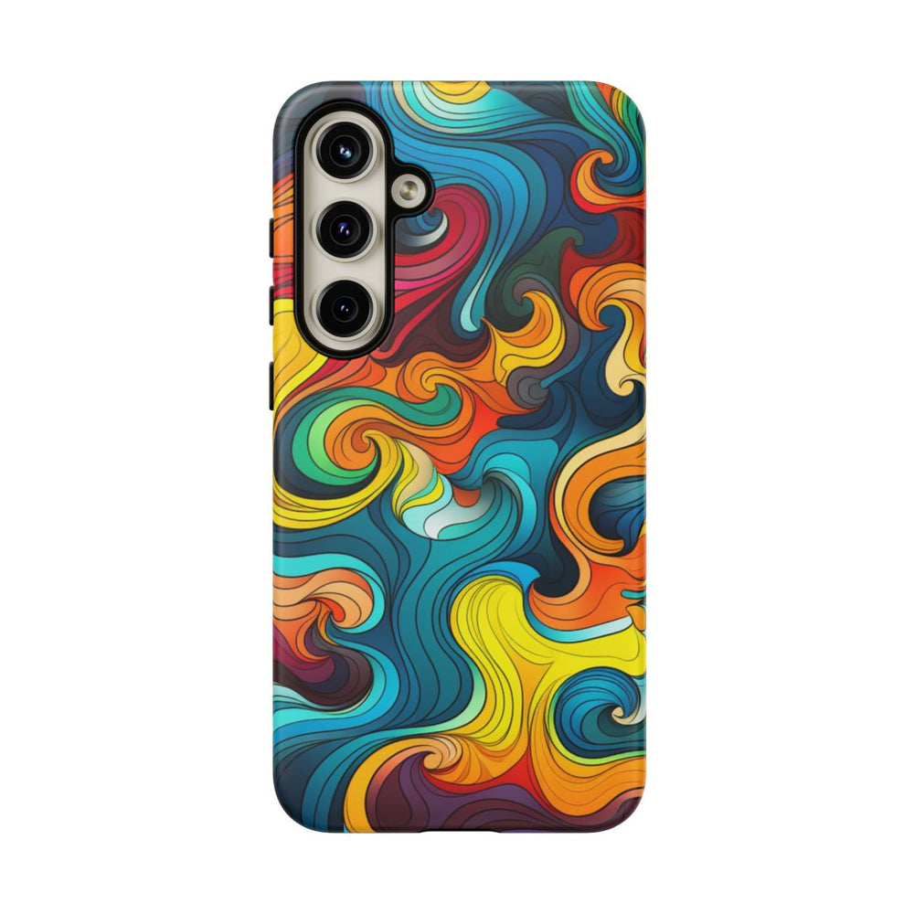 Dit telefoonhoesje heeft een opvallend draaikolkpatroon in levendige kleuren zoals rood, oranje, geel, blauw en groen. Het speelse ontwerp geeft een dynamische en energieke uitstraling, ideaal voor liefhebbers van een kleurrijke stijl. Dankzij de dubbele laag biedt het hoesje extra bescherming. Het hoesje ondersteunt draadloos opladen en is daardoor praktisch voor dagelijks gebruik.