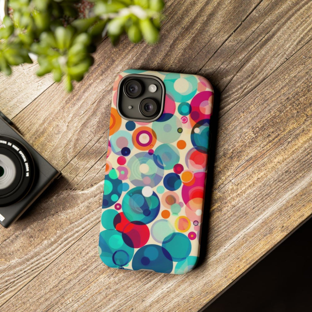 Dit hoesje heeft een opvallend patroon van overlappende cirkels in verschillende maten en kleuren. De cirkels zijn uitgevoerd in tinten blauw, roze, oranje, rood en paars, wat zorgt voor een levendig en dynamisch geheel. De zachte, licht beige achtergrond laat de kleuren extra goed uitkomen. Het patroon is gedrukt op een mat hoesje van polycarbonaat en TPU, dat bestaat uit twee beschermende lagen en geschikt is voor draadloos opladen. Het abstracte en speelse ontwerp geeft je telefoon een kleurrijke uitstraling.