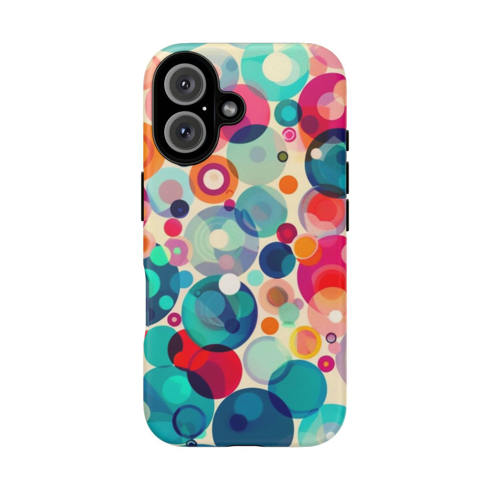 Dit hoesje heeft een opvallend patroon van overlappende cirkels in verschillende maten en kleuren. De cirkels zijn uitgevoerd in tinten blauw, roze, oranje, rood en paars, wat zorgt voor een levendig en dynamisch geheel. De zachte, licht beige achtergrond laat de kleuren extra goed uitkomen. Het patroon is gedrukt op een mat hoesje van polycarbonaat en TPU, dat bestaat uit twee beschermende lagen en geschikt is voor draadloos opladen. Het abstracte en speelse ontwerp geeft je telefoon een kleurrijke uitstraling.